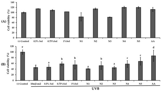 The result of (A) cytotoxicity of HaCaT cells with different concentrations of PWCC extract solution (0.5, 0.75, 1.0%), niosome formulations (N1–N5), and 100 µg/mL ascorbic acid (AA), and (B) Viability of HaCaT cells exposed to UVB radiation (10 mJ/cm2) with different concentrations of PWCC extract solution (0.5, 0.75, 1%), niosome formulations (N1–N5), and 100 µg/mL ascorbic acid (AA). Statistical significance was determined using Duncan’s test (p < 0.05), where different letters (a–d) denote significant differences among the groups for UVB protection. The (−) control was non-treated cells.