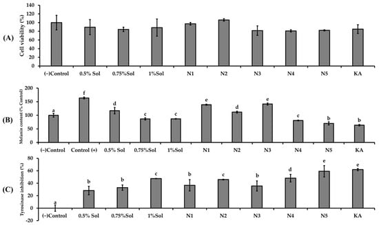 The effects of (A) different concentrations of PWCC extract solution, niosome formulations (N1–N5), and kojic acid (KA)100 µg/mL on B16F10 melanoma cells stimulated by α-melanocyte-stimulating hormone (α-MSH) were assessed in terms of melanin content (B) and tyrosinase inhibition (C). The control group consisted of untreated α-MSH-stimulated B16F10 melanoma cells. Data are presented as the mean ± SD from three independent replicates. Statistical significance was determined using Duncan’s test (p < 0.05), where distinct letters (a–f) denote significant differences among groups for melanin content and letters (a–e) indicate significant differences among groups for tyrosinase inhibition. (−) Control is non treated cells.