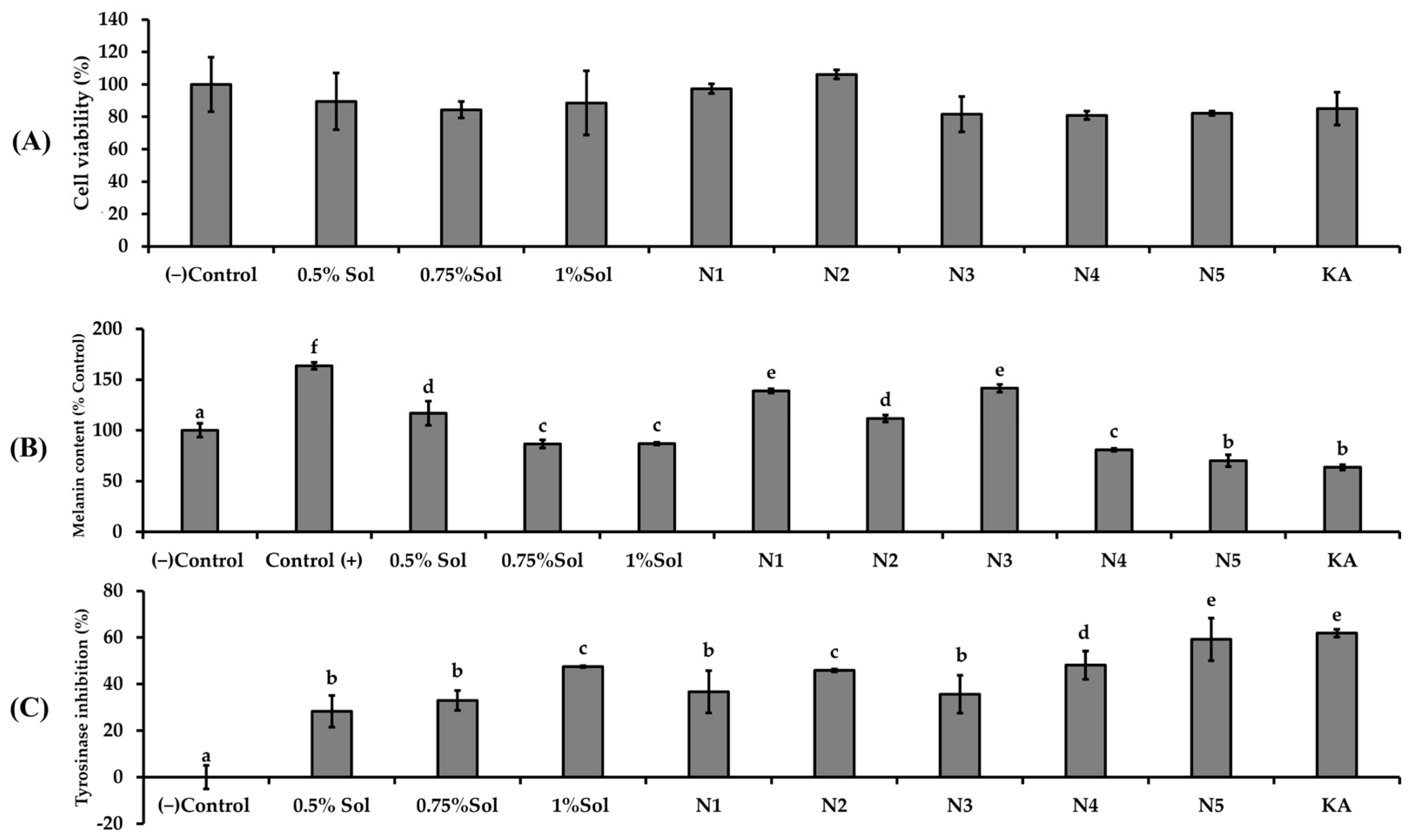 4.6.1. Cytotoxicity on the B16F10 Cells by the MTT Assay