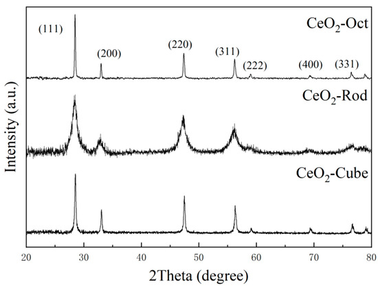 The crystal structures of CeO2-Rod, CeO2-Cube, and CeO2-Oct were characterized by XRD. As shown in Figure 2, the diffraction peaks at 2θ = 28.5°, 33.0°, 47.4°, 56.4°, 59.2°, 69.5°, 76.6°, and 79.1° in the XRD profile of cerium oxide clearly demonstrate the presence of the cubic fluorite structure of CeO2 (PDF # 81-0792).
