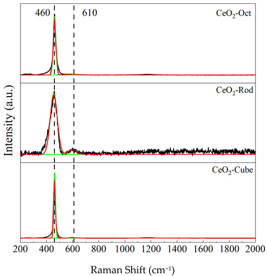 The Raman scattering method is used to identify the solid solution phase, which can indirectly reflect the properties of oxygen vacancies. Figure 4 shows the visible Raman spectra of all samples. In this pattern, a strong peak at ca. 460 cm−1 and a weak peak at ca. 610 cm−1 can be distinguished. The peaks at 460 cm−1 and 610 cm−1 correspond to the fluorite F2g mode and the defect-induced mode (D mode), respectively [22]. For CeO2, Raman bands at ca. 610 cm−1 are assigned to the presence of oxygen vacancies caused by the conversion of Ce4+ to Ce3+ [23]. The ratio of the integrated peak area of the oxygen vacancy (~610 cm−1) to that of the main peak area (460 cm−1) is defined as A610/A460, which is used to characterize the relative concentration of oxygen vacancies in these samples [19]. The ratio of A610/A460 is ranked in the order of CeO2-Rod > CeO2-Cube > CeO2-Oct (Table 3), indicating that CeO2-Rod exhibits a higher oxygen vacancy concentration, which is consistent with the previously mentioned XRD results.