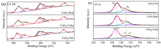 The oxidation state of the surface components of CeO2 was investigated by XPS analysis. Figure 5a is the XPS spectra of Ce3d core layers of all samples. The peaks V0/V0′, V1/V1′, and V2/V2′ refer to three pairs of spin-orbit doublets, which can be attributed to surface Ce4+ [24,25], while U0/U0′ and U1/U1′ can be ascribed to Ce3+ [26]. The relative content of Ce3+ in all samples can be calculated according to Equation (1) and is shown in Table 3. The data show that the content of Ce3+ in CeO2-Rod is higher than the content values of CeO2-Oct and CeO2-Cube, which is also consistent with the previously mentioned discussion results. The relative content of Ce3+ in CeO2 is related to oxygen vacancies because the formation of Ce3+ is usually accompanied by the presence of oxygen vacancies due to a balancing of the charge, which affects the concentration of Ce3+. Therefore, the higher the content of Ce3+, the more oxygen vacancies the samples possess.