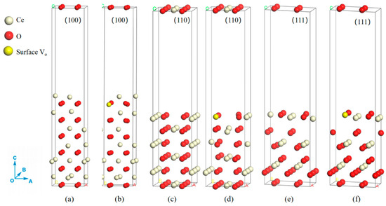 Formation energy of the (a) (100) CeO2 slab model, (b) (100) oxygen vacancy CeO2 slab model, (c) (110) CeO2 slab model, (d) (110) oxygen vacancy CeO2 slab model, (e) (111) CeO2 slab model, and (f) (111) oxygen vacancy CeO2 slab model. White, red, and yellow atoms represent Ce atoms, O atoms, and surface oxygen vacancies, respectively.
