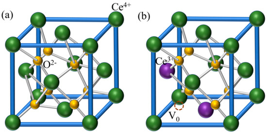 (a) The ideal crystal structure of CeO2. (b) The crystal structure of CeO2 when one oxygen vacancy is formed with two Ce3+ products.