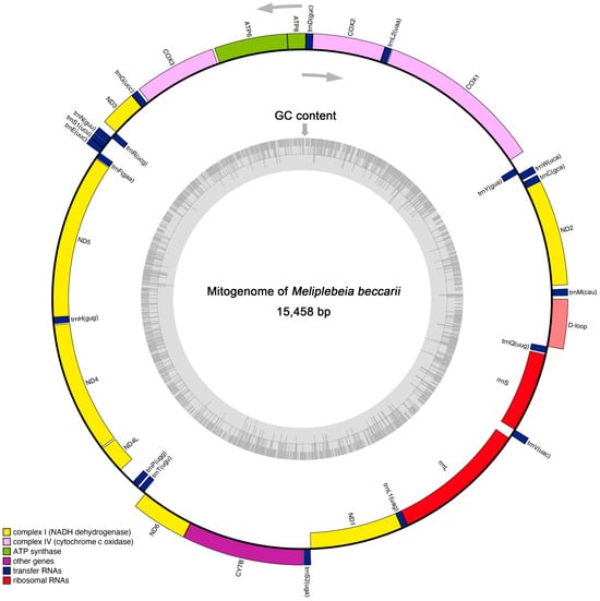 Mitochondrial genome (mitogenome) data have been used in phylogenetics and population genetics studies of many insect groups [] particularly useful for species conservation and biodiversity assessments []. Mitogenomic data have recently clarified evolutionary relationships in social bees and improved resolution where single-gene markers proved insufficient [,]. In previous studies, we have characterized the mitogenomes of several Meliponini species [,,], highlighting the importance of these sequences for understanding stingless bees. This understanding is crucial for developing effective management and conservation strategies. Despite these recent studies, complete mitogenomes remain sparse for native stingless bee species in Ethiopia, which constrains robust phylogenetic placement and the development of mitochondrial reference libraries that underpin species delimitation and mitochondrial-based biodiversity surveys. In the present study, we sequenced the complete mitogenome of M. beccarii and analyzed the gene order, nucleotide composition, and secondary structures of its tRNA genes. Additionally, we reconstructed the phylogenetic relationships between M. beccarii and other insects in Apoidea, contributing to broader research on mitochondrial function and its role in ecological adaptation.