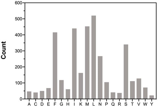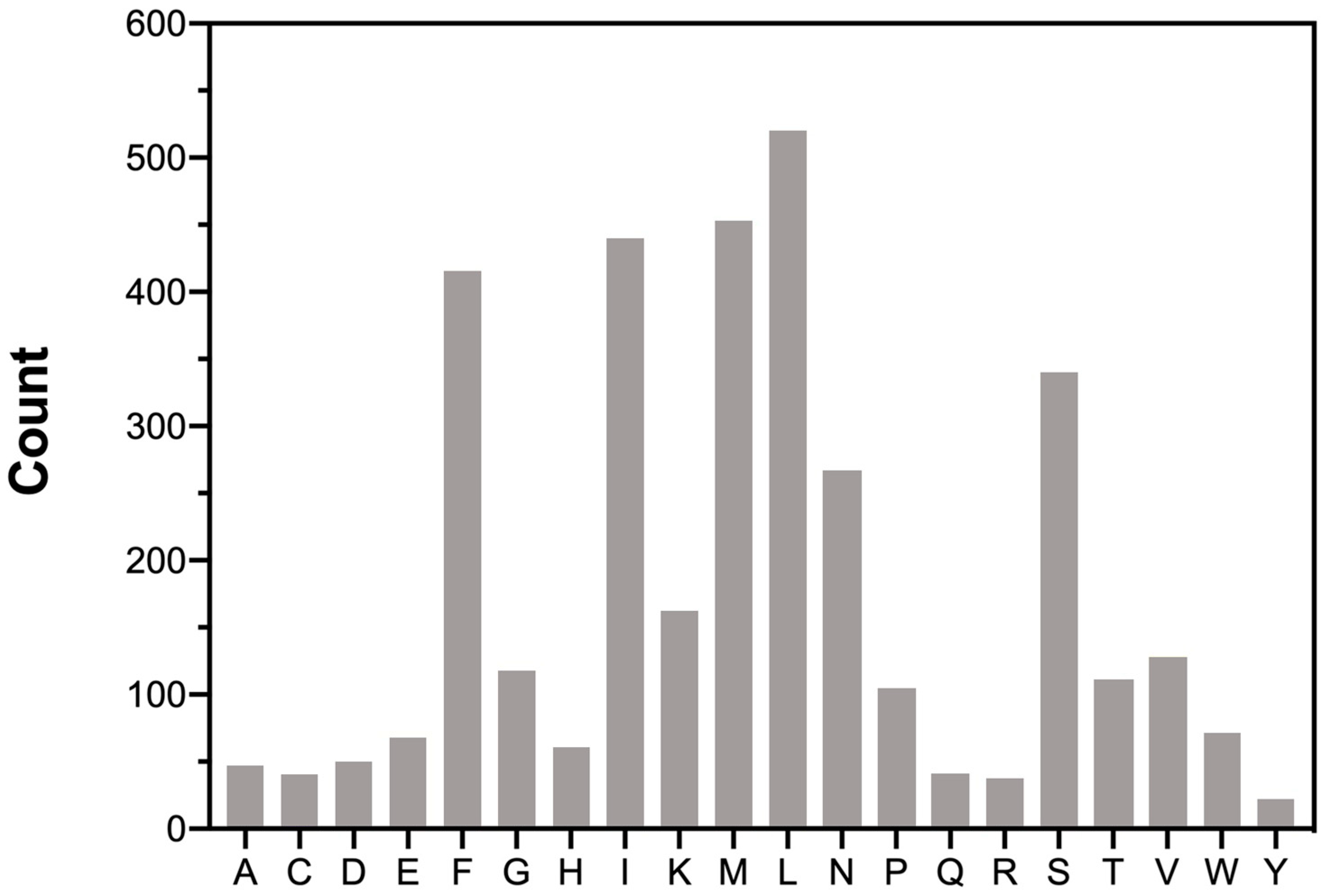 Amino acids distribution in the M. beccarii mitogenome. The number on the left is the total number of each amino acid. The 20 amino acid types are represented on the X-axis.