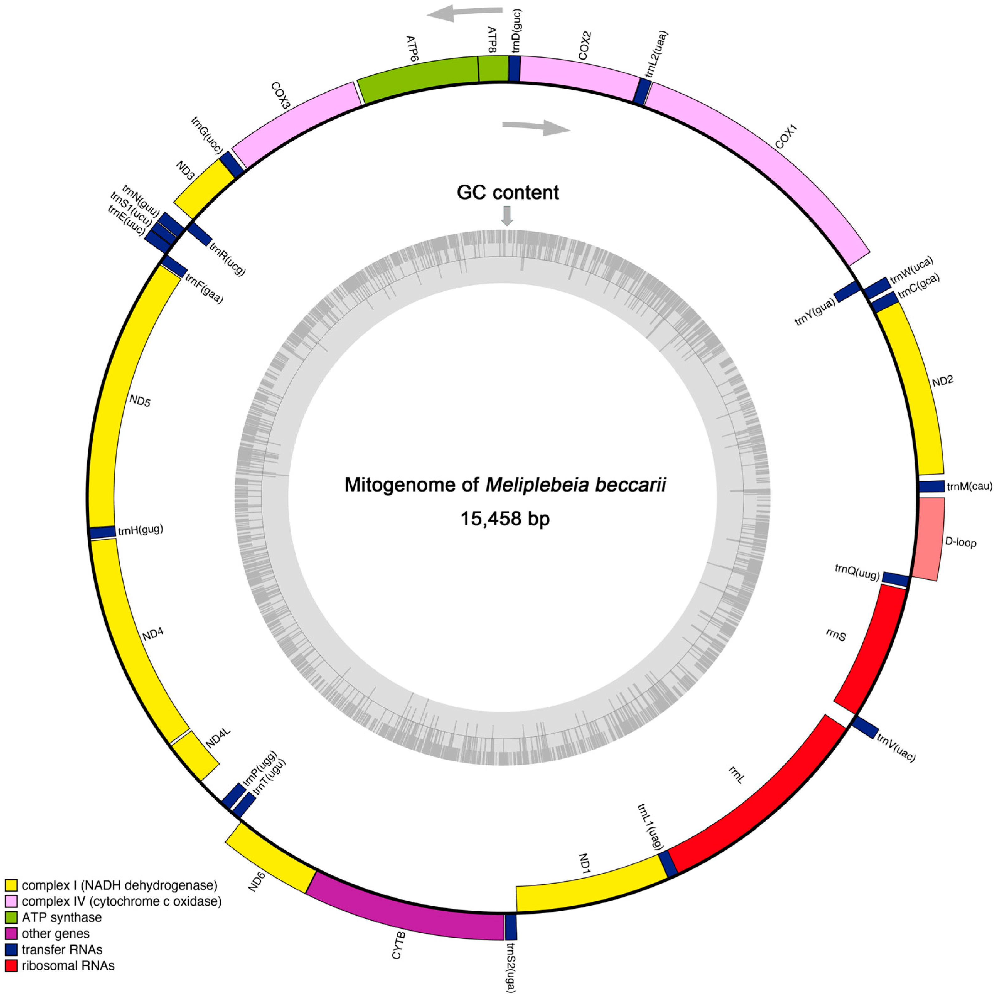 The circular map of complete mitogenome of M. beccarii. Genes distributed on the inner and outer sides of the loop exhibit distinct transcriptional orientations, as indicated by the two directional arrows. These orientations correspond to genes located on the mitochondrial genome’s light (N) strand and heavy (J) strand, respectively. The inner gray ring indicates the GC content across the entire mitogenome, analyzed using a sliding window approach.