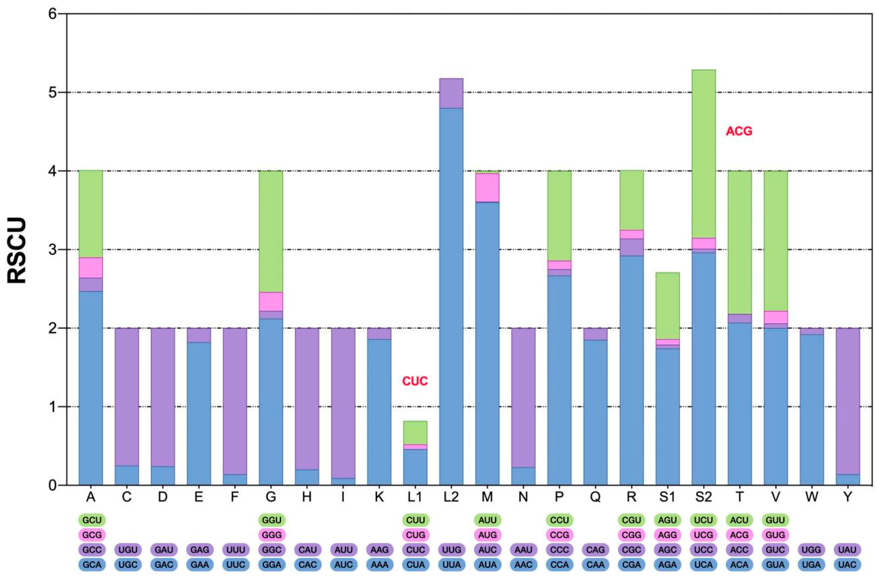 The relative synonymous codon usage (RSCU) in the mitogenome of M. beccarii. The type of codon is on the X-axis. Codons on bars (red font letters) indicate that they are not found in M. beccarii.