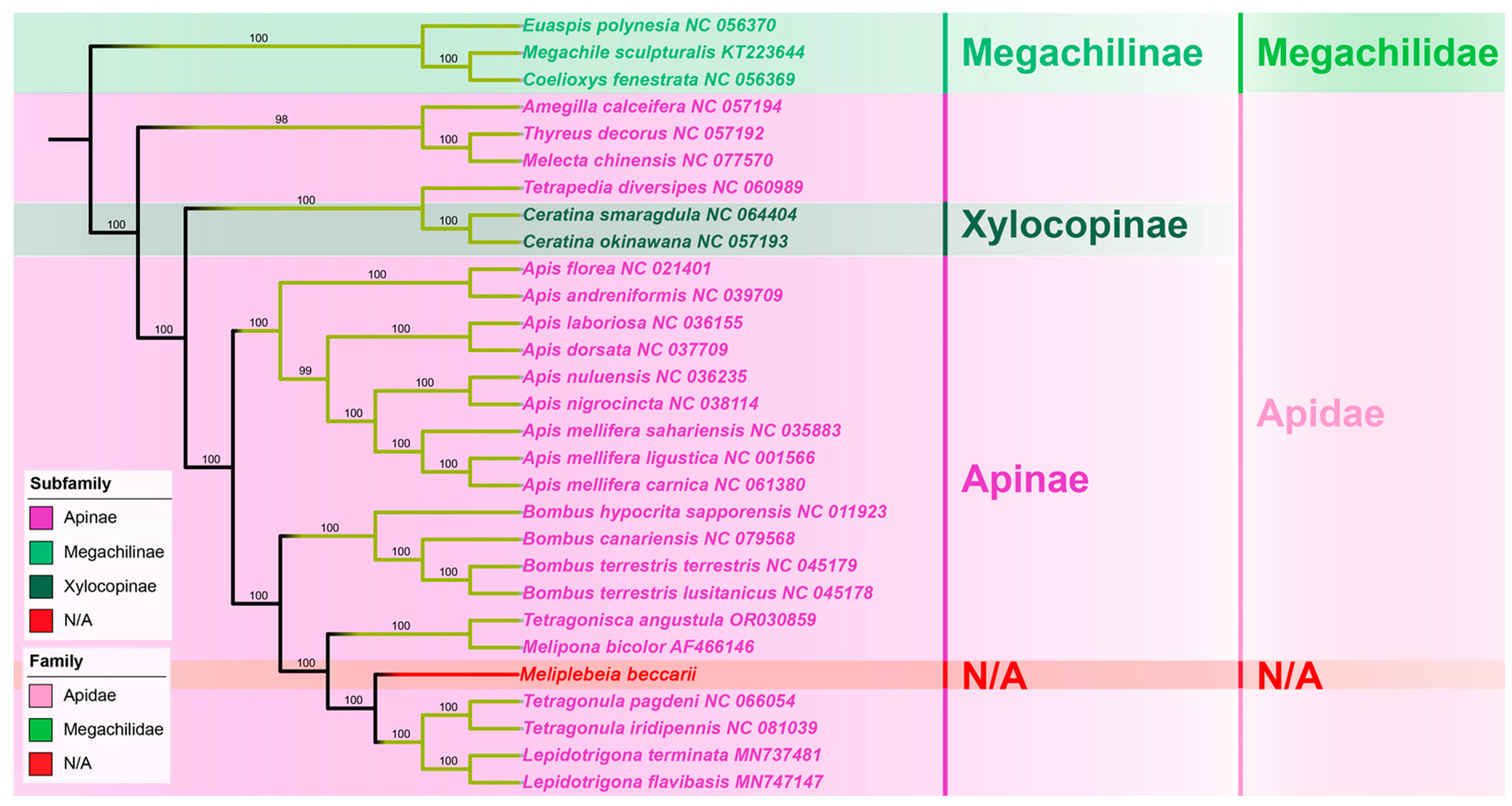 The gene order of the mitogenome of M. beccarii was compared with that of 14 species in Apidae (including Apis, Bombus, Meliponini), providing insights into the conservation and variability of mitogenome organization across the subfamily (Figure 5). The results showed that gene orders were largely preserved across multiple species, supporting their phylogenetic relationships. However, the mitogenome of M. beccarii exhibited unique features and rearrangements compared to other species, indicating species-specific adaptations or evolutionary divergence within Apidae.