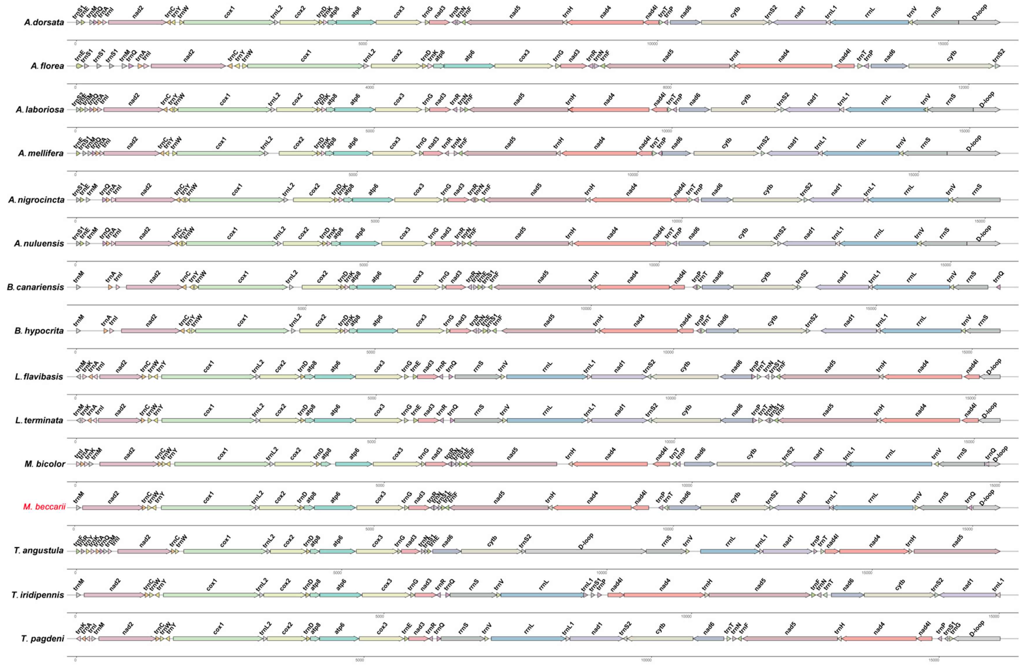 Comparative mitochondrial gene-order map of M. beccarii and 14 other Apidae species. Arrows of different colors indicate orthologous genes, with their direction representing transcriptional orientation. Identical genes across mitogenomes are marked with identical colors. Arrow lengths are proportional to the lengths of the corresponding genes. GenBank accession numbers for all mitogenomes are listed in the Data Availability Statement.