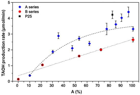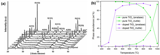 Besides inducing phase transformation, heat treatment affects morphology, crystallinity, porosity, and specific surface area of TiO2 and leads to the loss of surface hydroxyl groups and the removal of organic materials at high temperatures (≥400 °C). So, vice versa, anatase-rutile transformation is not only temperature dependent but also depends on many factors, such as particle size and shape, the presence of dopants or impurities, and their concentrations. An instructive example is a study by Low et al. [55] concerning the crystallization behavior of pure and Cr-doped TiO2 nanotubes prepared by the anodization process. The phase abundances of anatase and rutile as a function of temperature in pure TiO2 nanotube arrays are shown in Figure 3b. So, the anatase phase appears at 400 °C from amorphous TiO2 nanotubes, and its abundance decreases with an increase in temperature due to the appearance of the rutile phase at 600 °C. After 800 °C, the abundance of the rutile phase rapidly increases at the expense of the anatase phase. However, although its abundance is low, the anatase phase remains present even at 1000 °C. On the other hand, in the presence of Cr dopant, the rapid formation of the anatase phase occurs when the annealing temperature rises from 300 to 400 °C and continues to increase until 900 °C (see Figure 3b). However, the abundance of the rutile phase in the high-temperature range is negligible, suggesting that, without getting into an explanation, the rutile phase is unstable.