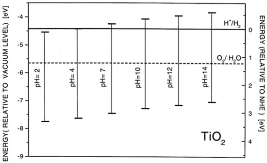 Besides the ability to harvest solar light, the energy level alignment is an equally important semiconductor characteristic that determines its photocatalytic ability. The pH-dependent position of the valence band maximum (VBmax) and the conduction band minimum (CBmin) in anatase, related to H+/H2 and O2/H2O potentials, is presented in Figure 4 [55]. The VBmax and CBmin potentials change following the Nernst equation, i.e., −0.059 V per pH unit. Considering the position of VBmax and CBmin in TiO2, the photogenerated holes are powerful oxidants, while photogenerated electrons are good reductants.