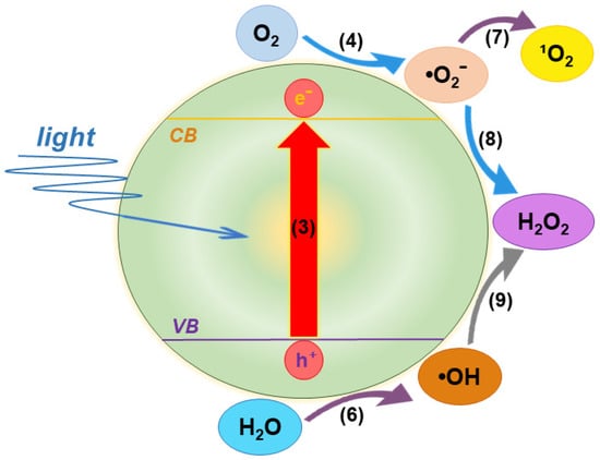 The photocatalytic processes involve redox reactions on heterogeneous solid surfaces induced by photogenerated charge carriers. The electron transfer reactions of photogenerated electrons and holes with oxygen and water (hydroxyl ions) are crucial because photocatalytic processes occur in an aqueous environment under aerobic conditions. Thus, oxygen converts into highly reactive species, generally referred to as ROS, which further participate in oxidative and reductive processes. The main ROS are superoxide radical anion (), hydrogen peroxide (H2O2), singlet oxygen (1O2), and hydroxyl radical (HO•) [62].