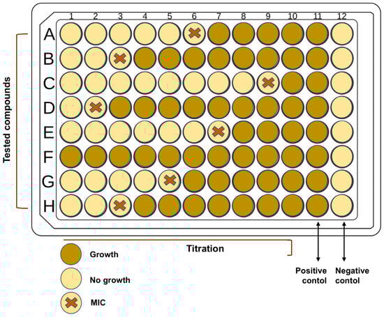 For clarity, in Figure 6, we schematically presented the principle for MIC determination by both dilution methods (agar dilution method and broth dilution method) for several antibacterial agents (from A to H) with increasing concentrations (from 1 to 10) [77]. Positive control tests are experiments performed without antibacterial agents, while, on the other hand, bacteria are absent in negative control tests. The cross labels the MICs.