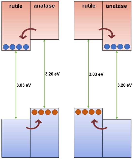 The most extensively studied photocatalyst is Degussa P25, whose properties, such as phase composition (anatase to rutile ratio is 80 to 20 percent), specific surface area (50 m2/g), and primary particle size (~20 nm), are well-documented in the literature [78]. The energy band alignment at the anatase/rutile interface is responsible for the high activity of TiO2 P-25 powder in various photocatalytic processes. As seen in Figure 7 (left), there has been a consensus since 1996 that the conduction band of anatase is displaced negatively by 0.2 eV in comparison to the conduction band of rutile, based on electrochemical experiments by Kavan et al. [79]. The transfer of photogenerated electrons from anatase to rutile and the transfer of holes from rutile to anatase are both favored by this energy band alignment. Nonetheless, anatase and rutile have similar valence band locations. However, as illustrated in Figure 7 (right), photogenerated electrons move from rutile into anatase, as demonstrated by photoemission [80] and electron paramagnetic resonance experiments [81] conducted on mixed rutile/anatase samples about ten years later. Numerous density functional theory calculations corroborate these experimental results, showing that the valence band of rutile has an energy that is approximately 0.4 eV higher than that of anatase [82]. In contrast to pure phases, anatase/rutile composites, of which the Degussa P25 is the most widely used benchmark material, display synergistic effects in photoinduced catalytic processes, despite disagreements regarding energy alignment in mixed-phase TiO2. Since both heterostructures are type II (staggered gap), the most straightforward explanation for this synergy depends on the band alignment, regardless of which of the two shown in Figure 7 is correct. This increases the efficiency of the separation of photogenerated charge carriers and, in turn, influences their lifetime.