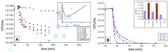 (A) Effect of TiO2 concentration (Degussa P25) on the inactivation of 107–108 CFU/mL E. coli suspensions. Inset: Irradiation time required to decrease the bacteria concentrations from 108 to 105 CFU/mL as a function of TiO2 concentration. (B) Photocatalytic E. coli inactivation in the presence of 0.25 g/L TiO2 under UVA, UVB, and UVC illumination. Inset: The concentration of E. coli after 10 min of illumination in the presence or absence of TiO2 using different UV light [103].