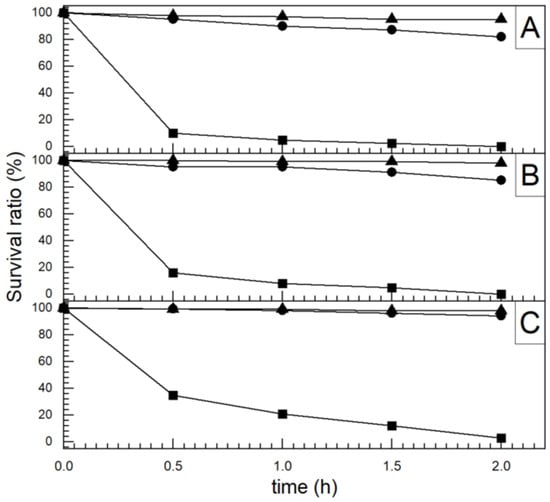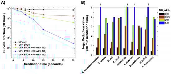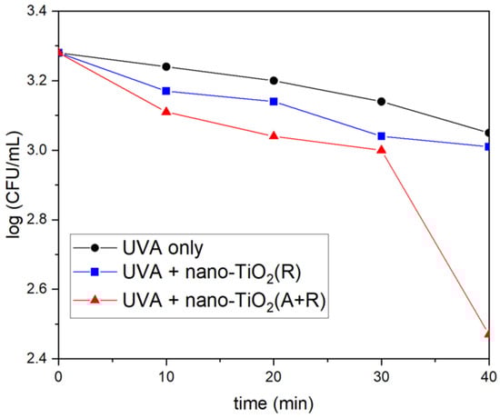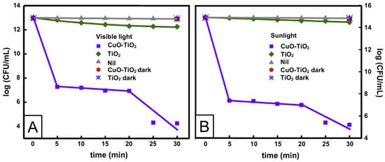 where C0 (CFU) and C (CFU) are the number of bacterial colonies in the sample without (control) and in the presence of an antibacterial agent, respectively. Another way to express time-kill curves is to use a log scale for the surviving bacteria in the semi-log diagrams. Knowing that the inactivation of bacterial species by TiO2 is facilitated by photogenerated ROS, the two modified positive control tests should be conducted. The first control test, without antibacterial agents, has to be performed under the same illumination conditions to verify that UV light does not directly kill microorganisms. The second control test has to be performed in the dark to estimate the extent of the inactivation of bacteria due to the contact with the TiO2 surface, as reported in a few research articles [57,58,59,60].