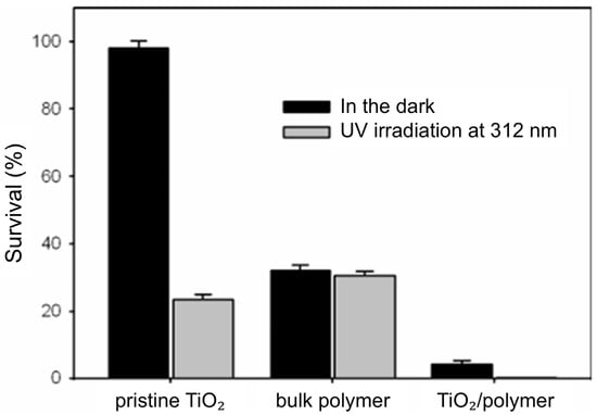 Although the subject of this review is the photocatalytic inactivation of pathogens by TiO2, several reports indicated the inactivation of microbial species by TiO2 in the dark [57,58,59,60]. For example, Pagnout et al. [57] reported that the cell viability of E. coli is severely affected at pH 5.5 due to their accumulation onto the TiO2 surface, facilitated by the electrostatic interaction between positively charged TiO2 surface hydroxyl groups and negatively charged bacterial walls. This phenomenon was observed at a much lower degree at pH 7.0, close to the pHZPC of TiO2, while at pH 9.5, it is negligible since both TiO2 and cells have negatively charged surfaces.