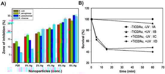 Finding the optimal concentration of Degussa P25 and the optimal light irradiation intensity, as well as the impact of the various UV light spectral domains (UVA (315–400 nm), UVB (280–315 nm), and UVC (100–280 nm)), pH, and temperature, was the main goal of the early research. The work by Benabbou et al. [103] on TiO2 Degussa P25’s inactivation of E. coli under various physicochemical conditions is informative in this regard, among many others. Figure 8A and Figure 8B, respectively, display typical findings regarding the dependence of E. coli inactivation rates on illumination utilizing UV light sources with varying spectral profiles and Degussa P25 concentration. As illustrated in Figure 8B, we stress the significance of comparing microbial inactivation tests for simply photolytic versus photocatalytic experiments. In contrast to the photocatalytic tests using Degussa P25 (inset to Figure 8B), nonsignificant inactivation of E. coli was noted in photolytic experiments employing UVA or UVB. However, the UVC photolysis was significantly more effective than the Degussa P25-assisted photocatalytic inactivation of E. coli.