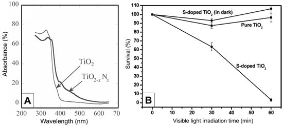 - Rengifo-Herrera, J.A.; Mielczarski, E.; Mielczarski, J.; Castillo, N.C.; Kiwi, J.; Pulgarin, C. Escherichia coli inactivation by N, S co-doped commercial TiO2 powders under UV and visible light. Appl. Catal. B 2008, 84, 448–456. [Google Scholar] [CrossRef]