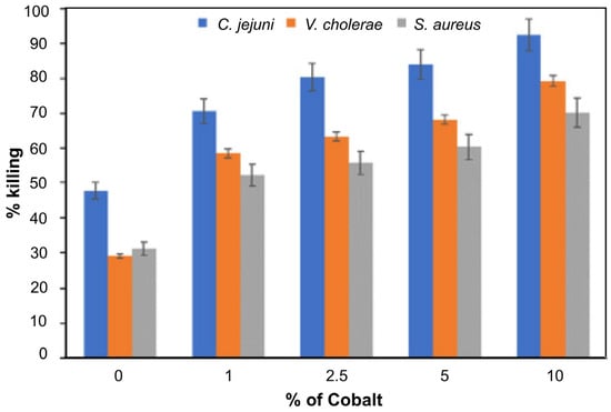 - Ali, M.; Hussain, R.; Tariq, F.; Noreen, Z.; Toufiq, A.M.; Bokhari, H.; Akhtar, N.; Rahman, S.U. Highly effective visible light-activated cobalt-doped TiO2 nanoparticles for antibacterial coatings against Campylobacter jejuni. Appl. Nanosci. 2020, 10, 1005–1012. [Google Scholar] [CrossRef]