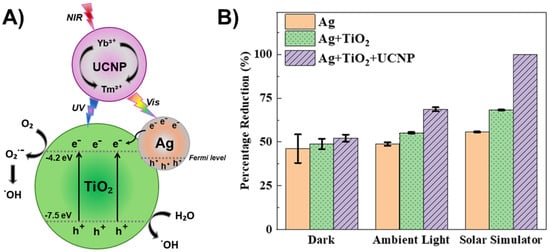 - Zhang, M.; Chen, W.; Choi, W.; Yu, J.; Deng, Y.; Xie, X.; Lin, Z. Ternary Biocidal-Photocatalytic-Upconverting Nanocomposites for Enhanced Antibacterial Activity. ACS Sustain. Chem. Eng. 2022, 10, 4741–4749. [Google Scholar] [CrossRef]