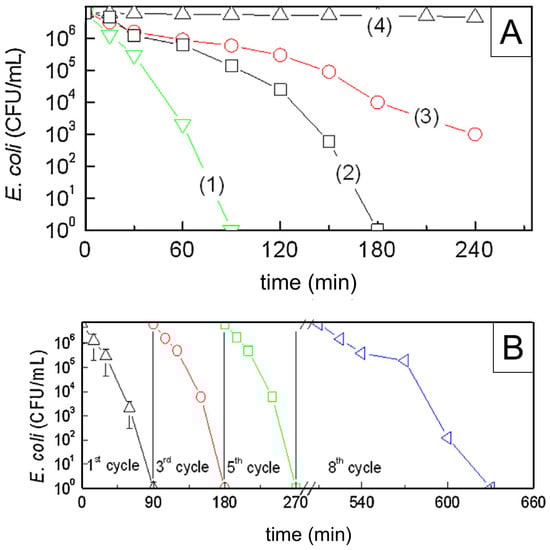 - Paschoalino, M.; Guedes, N.C.; Jardim, W.; Mielczarski, E.; Mielczarski, J.A.; Bowen, P.; Kiwi, J. Inactivation of E. coli mediated by high surface area CuO accelerated by light irradiation >360 nm. J. Photochem. Photobio. A 2008, 199, 105–111. [Google Scholar] [CrossRef]