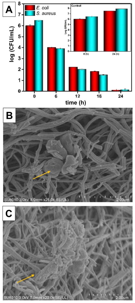 - Shahriari-Khalaji, M.; Zabihi, F.; Bahi, A.; Sredojević, D.; Nedeljković, J.M.; Macharia, D.K.; Ciprian, M.; Yang, S.; Ko, F. Photon-driven bactericidal performance of surface-modified TiO2 nanofibers. J. Mater. Chem. C 2023, 11, 5796–5805. [Google Scholar] [CrossRef]