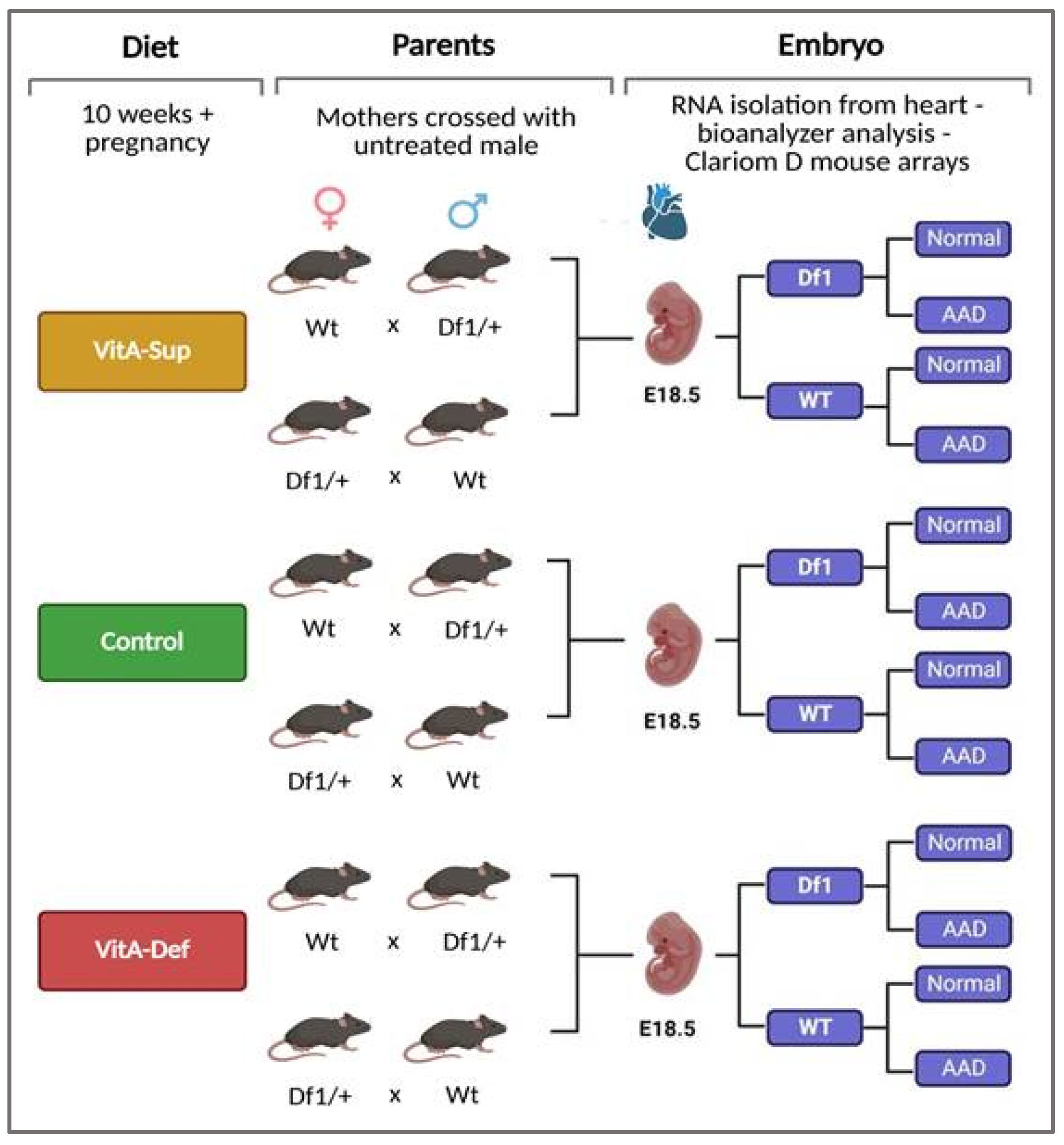 - Comparison 3 (C3): Cardiac gene expression from Df1/+ embryos with AADs from WT mothers fed a VitA-Sup diet (HRG1-AAD) versus cardiac gene expression from Df1/+ embryos with an AAD from Df1/+ mothers fed a VitA-Sup diet (non-HRG2) (Figure 3(C3)).