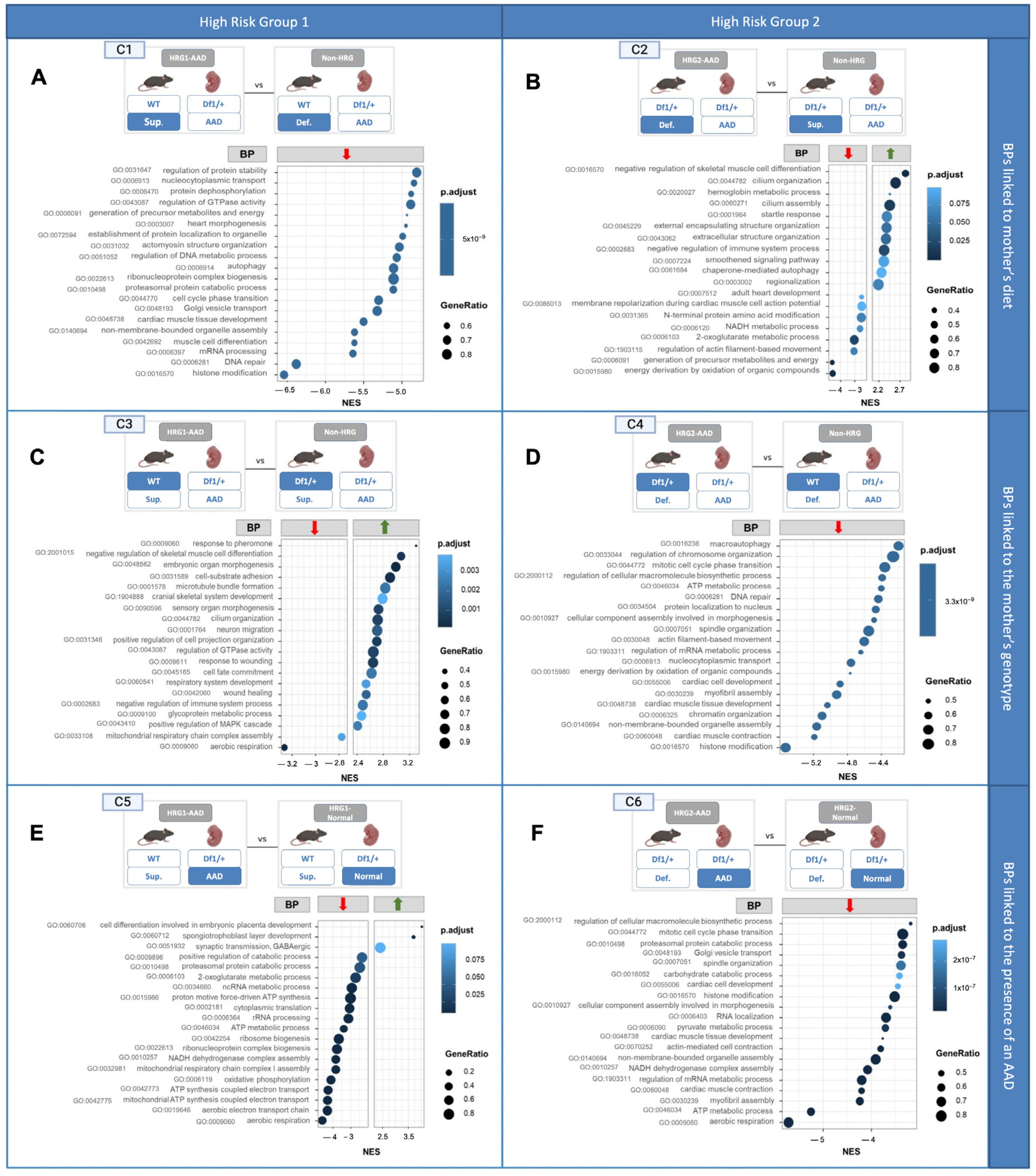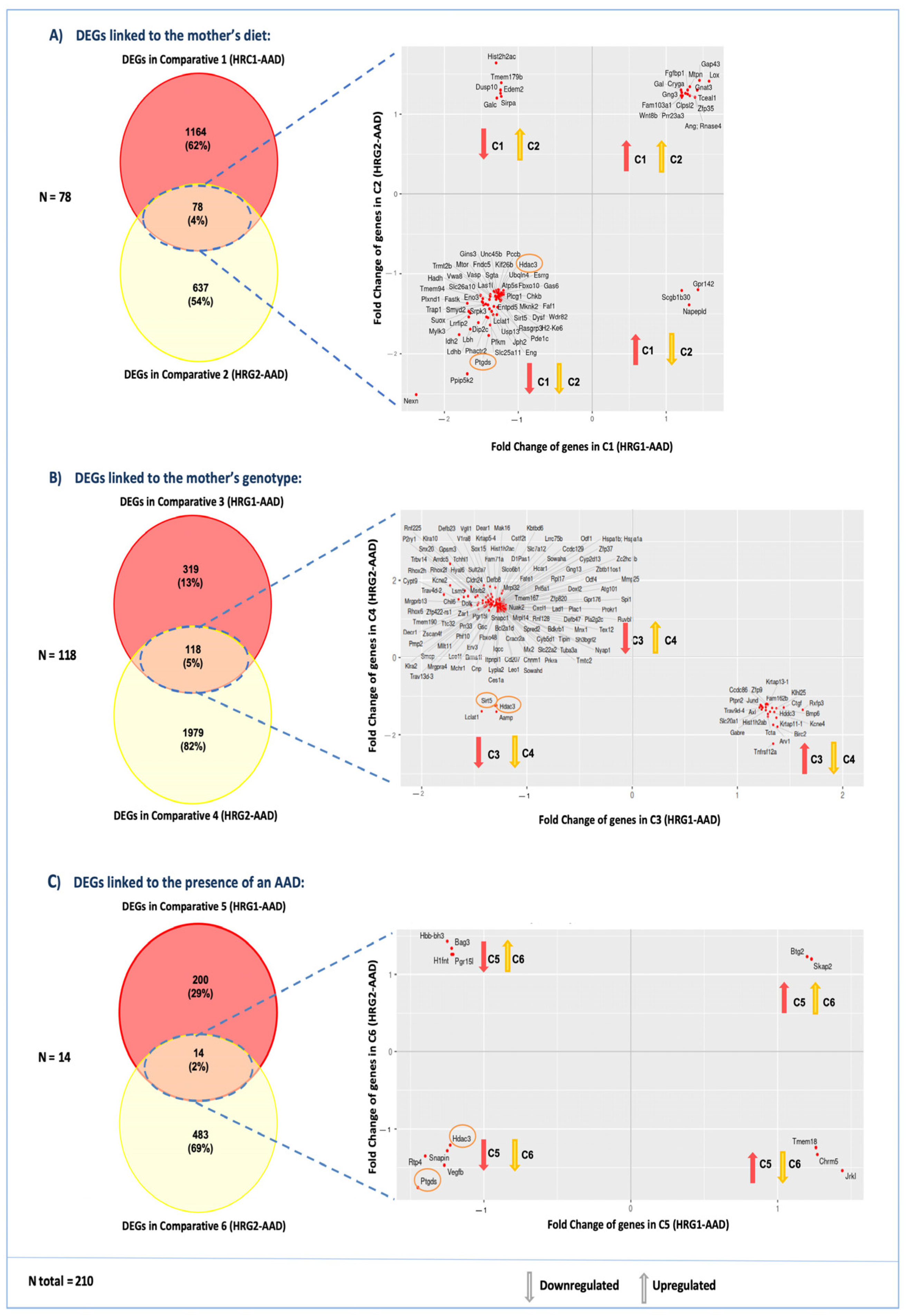 - Comparison 4 (C4): Cardiac gene expression of Df1/+ embryos with an AAD born from Df1/+ mothers fed a VitA-Def diet (HRG2-AAD) versus cardiac gene expression of Df1/+ embryos with an AAD born from WT mothers fed a VitA-Def diet (non-HRG1) (Figure 3(C4)).