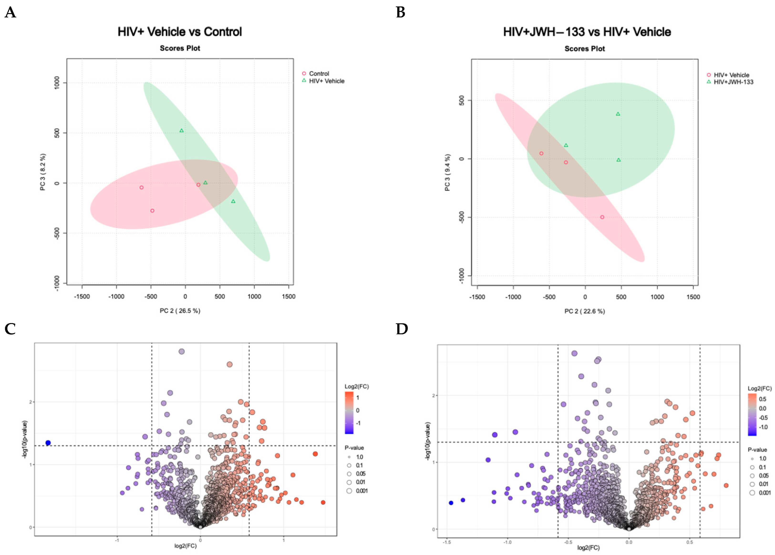 Following an already developed protocol at the Translational Proteomics Center [15,76,77], we used MetaboAnalyst 5.0 for protein statistical analysis. MetaboAnalyst is a user-friendly, streamlined metabolomics data analysis platform (https://www.metaboanalyst.ca/home.xhtml, accessed on 3 September 2025) [78,79,80] that is also used for statistical analyses of proteomics data [25,78,79,80,81,82]. We determined the statistically differential protein abundance using a single-channel analysis of HIV+MDM-JWH-133 vs. HIV+MDM-vehicle and HIV + vehicle vs. uninfected vehicle. Differentially expressed proteins were considered significant with a fold change cutoff of 1.5 (|Log2 FC| ≥ 0.58) and p-value < 0.05. (i.e., p-value ≤ 0.05, 95% confidence). We used normalized abundances [25] provided by Yadira Cantres from the Translational Proteomics Center (File name: TMT_Analy-sis_Alana_Mera_26Nov2024_Exp26Nov2024.xlsx). Then, 2D principal component analyses (PCAs) were performed for both comparisons, using the protein concentration as the evaluating variable (PERMANOVA p-value (based on 999 permutations) = 0.2, 95% confidence). For the volcano plot, the threshold was set as −log10 p-value ≥ 1.30 (or p-value ≤ 0.05) and a fold change cutoff of 1.5 (|Log2 FC| ≥ 0.58).