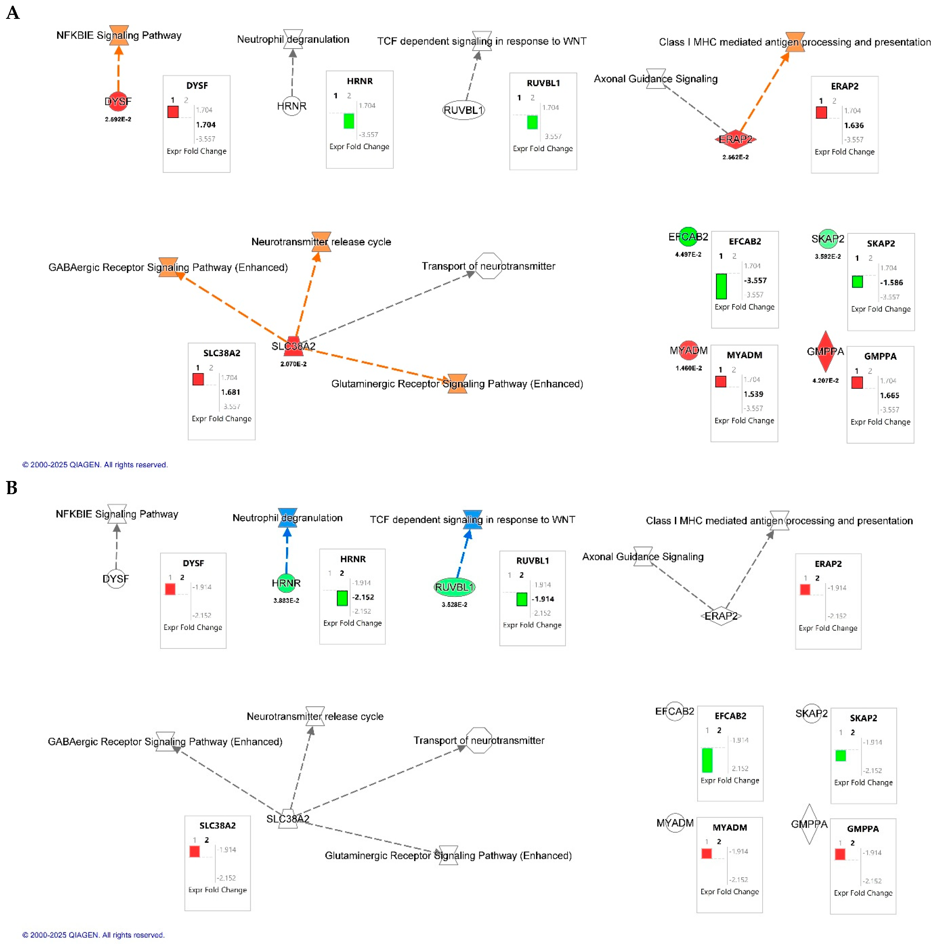 Figure 3. Canonical pathway overlay analysis of differentially expressed proteins identified by quantitative proteomics in HIV-infected macrophages. Canonical pathway maps were generated using Ingenuity Pathway Analysis (IPA; QIAGEN Inc., Redwood City, CA, USA). (A) Comparison of HIV+MDM-vehicle vs. control. (B) Comparison of HIV+MDM- JWH-133 vs. HIV+MDM-vehicle macrophages. Networks highlight molecular interactions and biological pathways affected by HIV infection and CB2R agonist treatment, including NF-κB inhibitor epsilon (NFKBIE) signaling, GABAergic and glutamatergic receptor signaling, class I MHC-mediated antigen processing and presentation, and the neurotransmitter release cycle. Box plots next to each node display the log2 fold change (FC) values for individual proteins, with p-values shown below the symbols for significant results. The black bars labeled “1” or “2” within the fold change boxes denote the dataset used for the overlay, corresponding to Dataset 1 (HIV+MDM-vehicle vs. control) and Dataset 2 (HIV+MDM JWH-133 vs. HIV+MDM-vehicle), respectively. Orange and red nodes indicate upregulated proteins or pathways, while green and blue nodes represent downregulation relative to the comparison group.