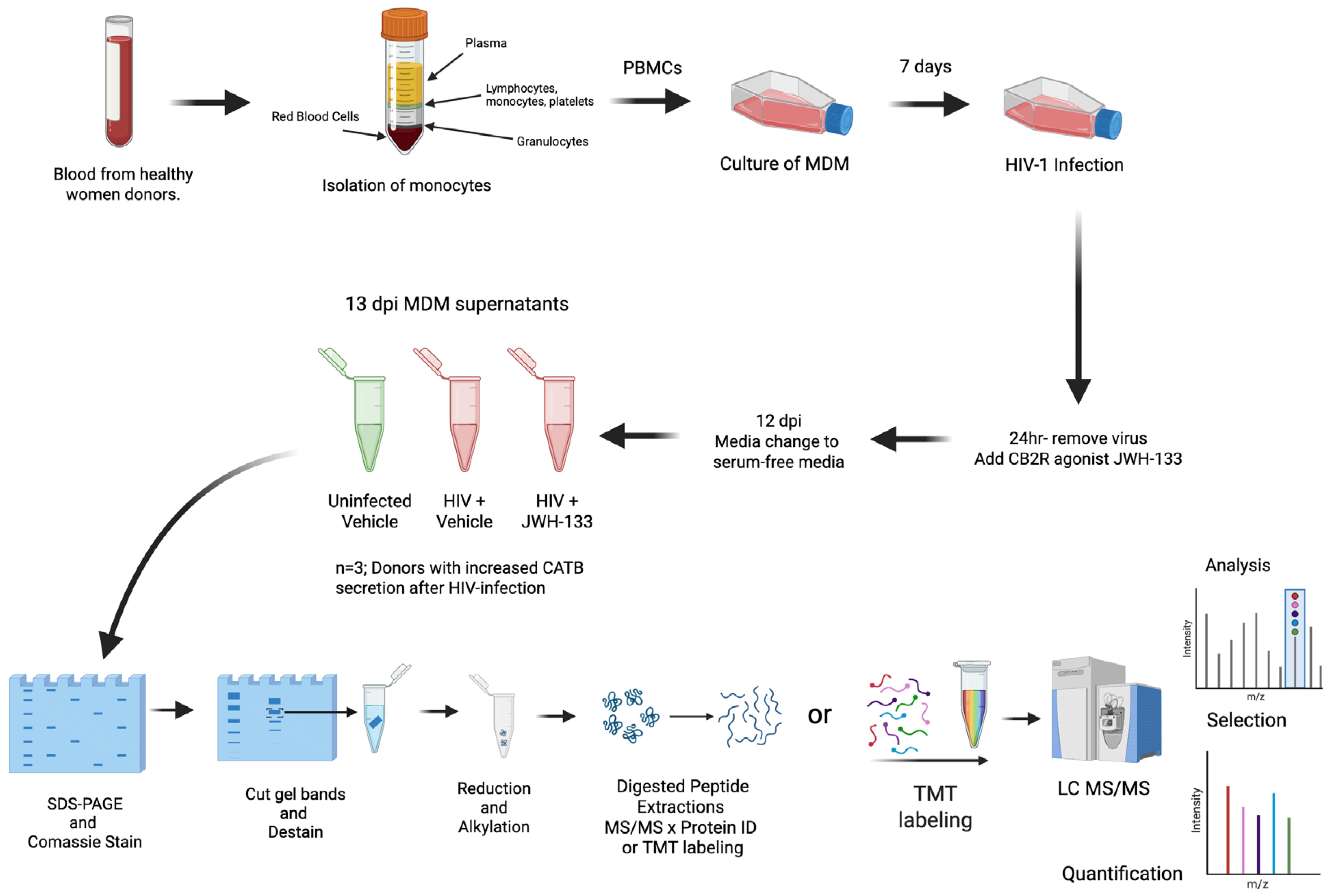Figure 4. Diagram of experimental design focusing on HIV-1-infected MDM secretome after exposure to JWH-133. Colors in the tube of isolation of monocytes indicates the separation of blood components (yellow = plasma; blue = lymphocytes, monocytes, and platelets, white = granulocytes, and red = red blood cells). In the tubes of 13 dpi MDM supernatants, green color represents uninfected samples, whereas red color represents HIV-positive samples. Colors in the TMT labeling indicate the 11 different molecular weight tags added to peptide samples prior to mass spectrometry analysis.