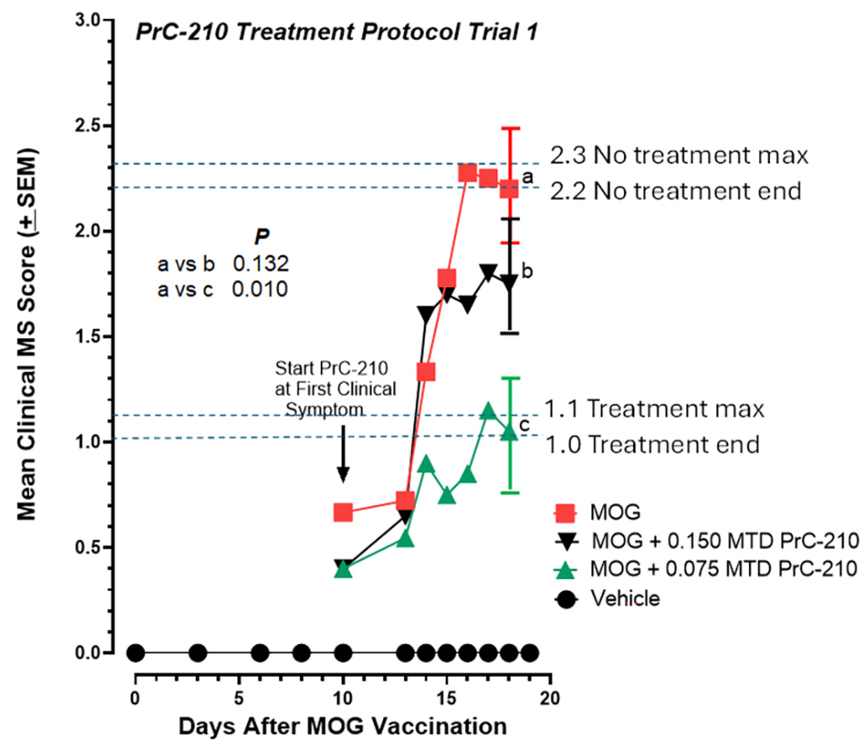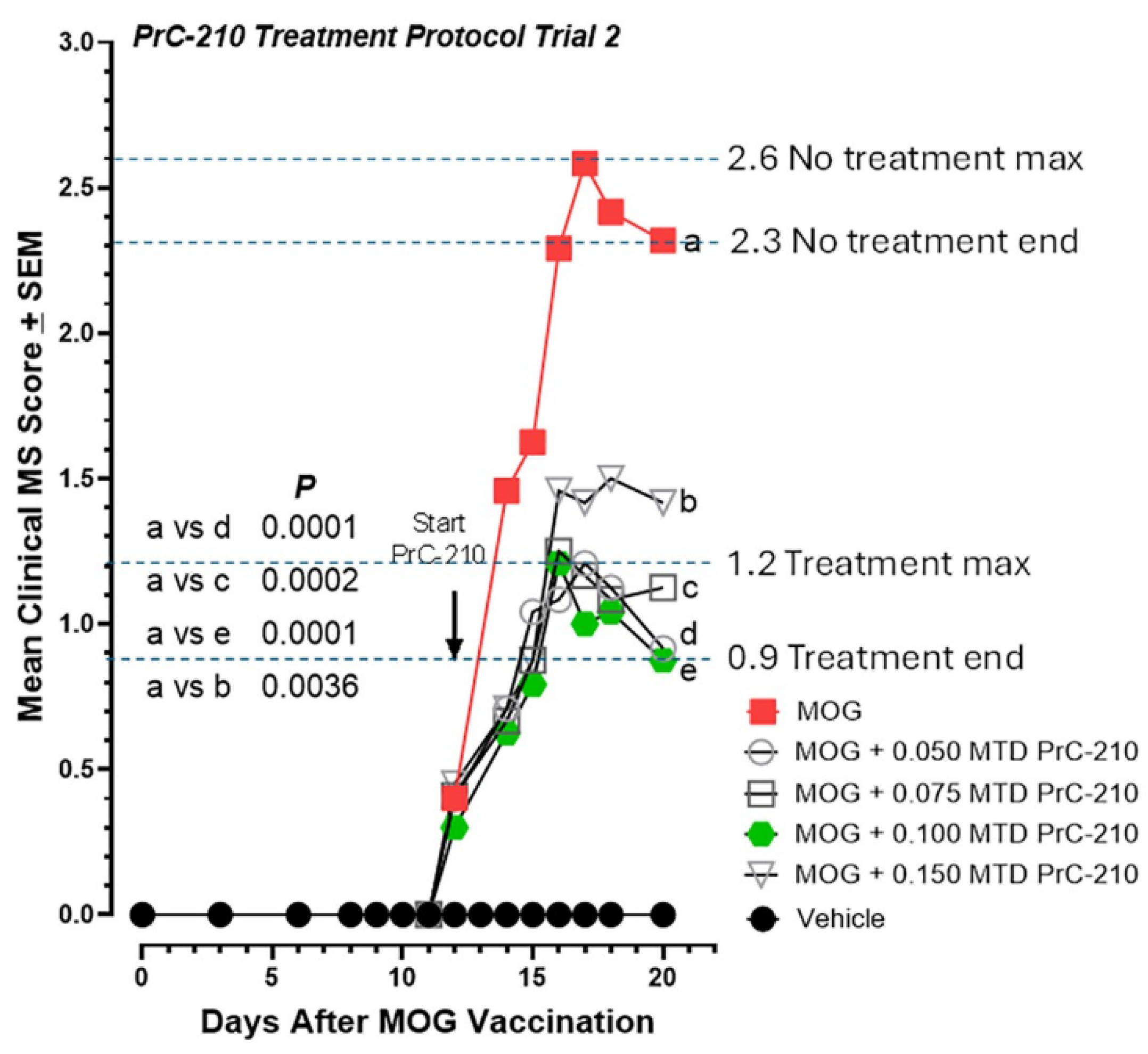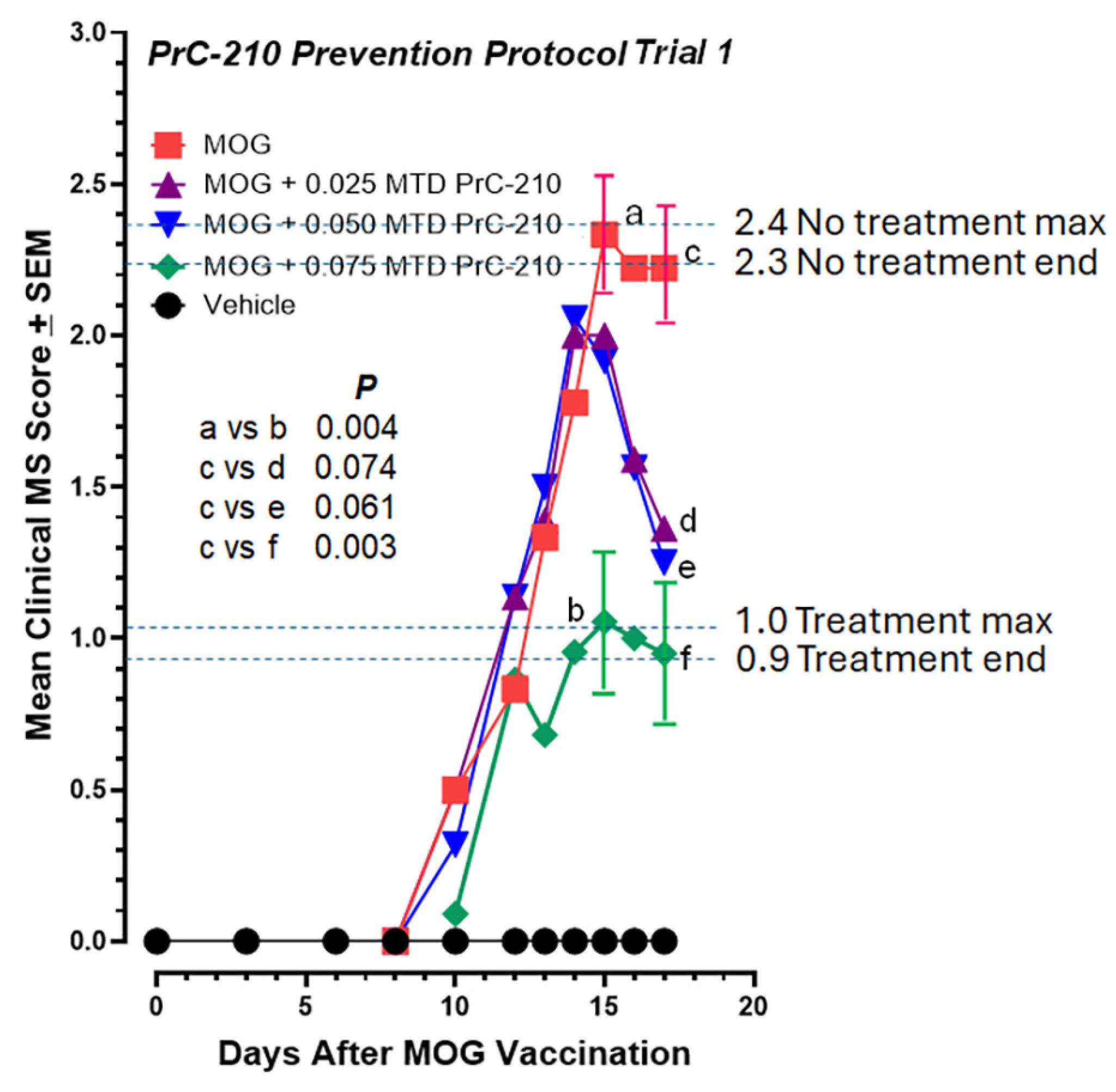 2.4. Higher-Dose PrC-210 Treatment Protocol to Suppress EAE Paralysis