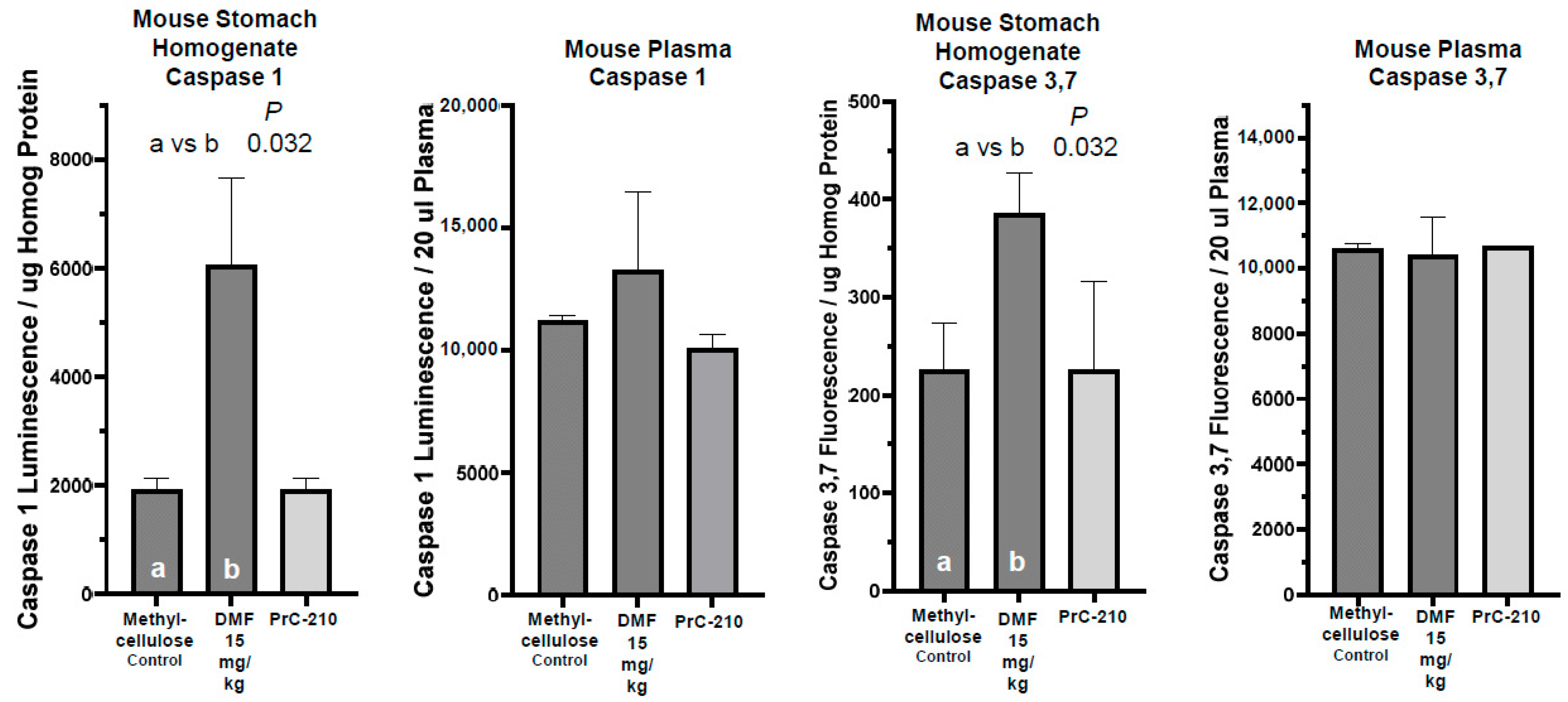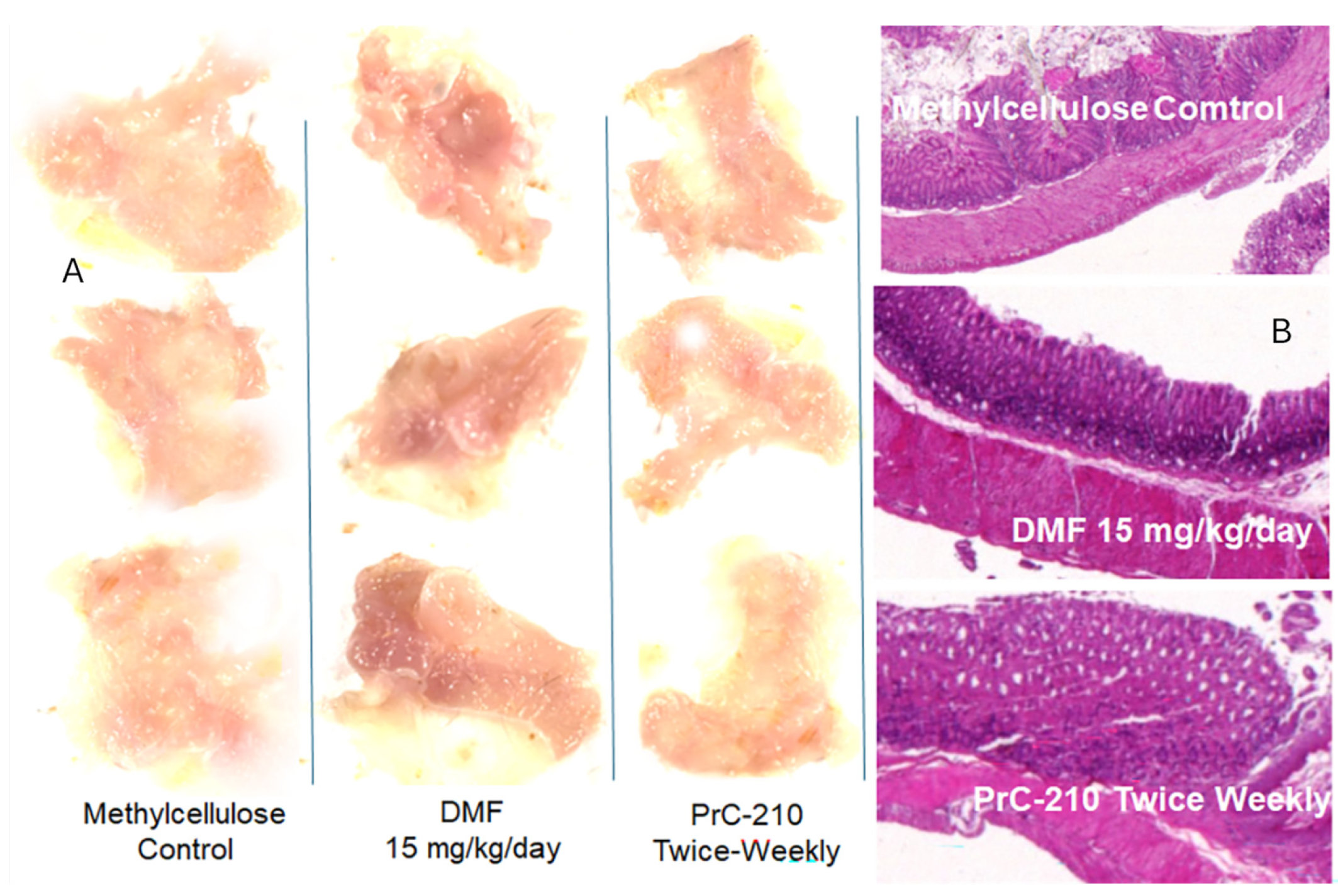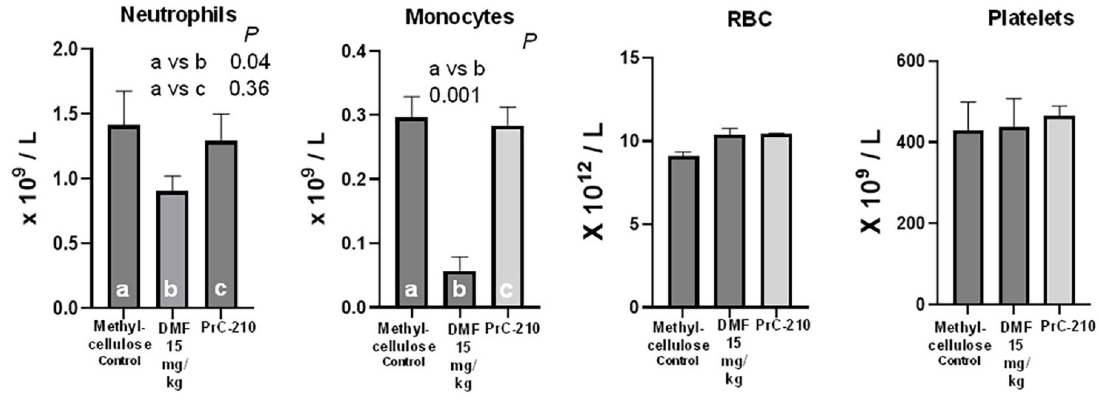 2.6. Oral DMF’s Toxicity Versus That of Oral Control or Oral PrC-210 Treatments