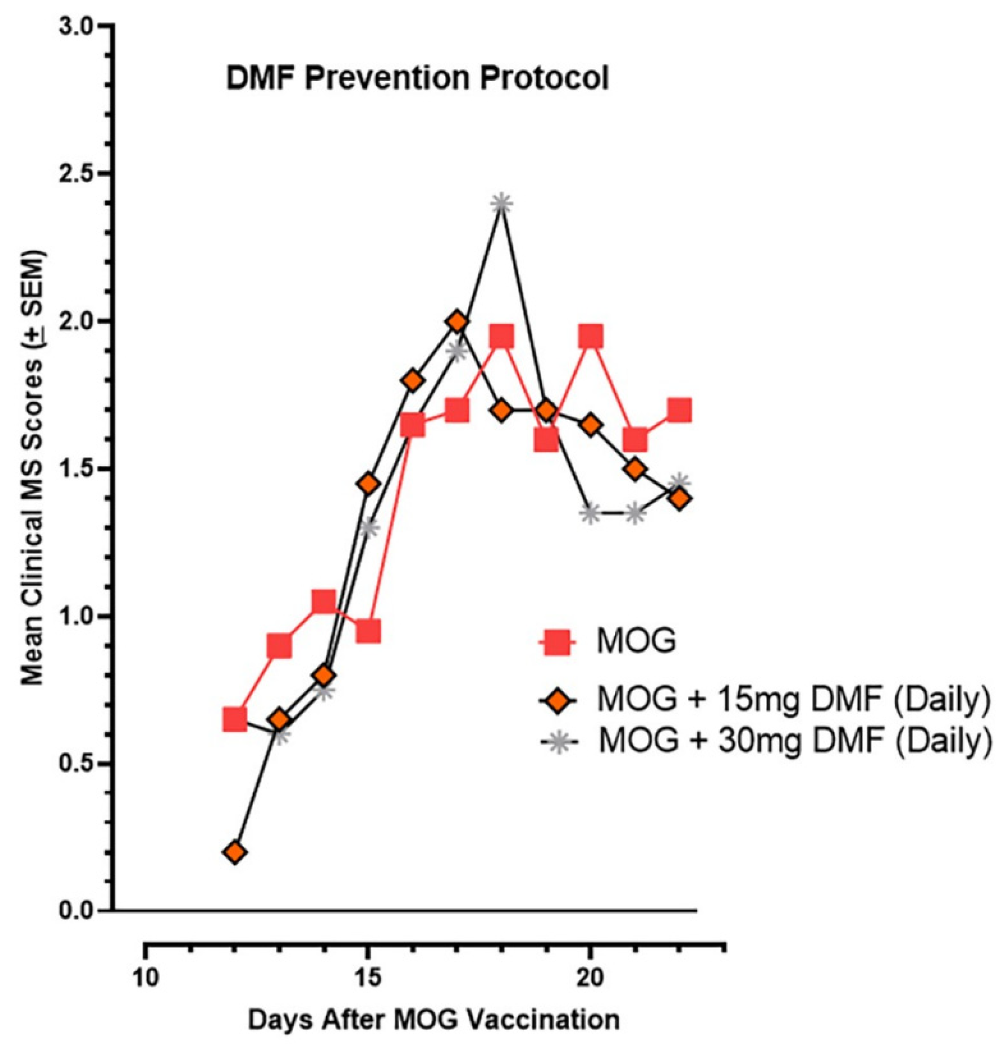 2.7. Oral DMF’s Efficacy in Suppressing EAE Paralysis