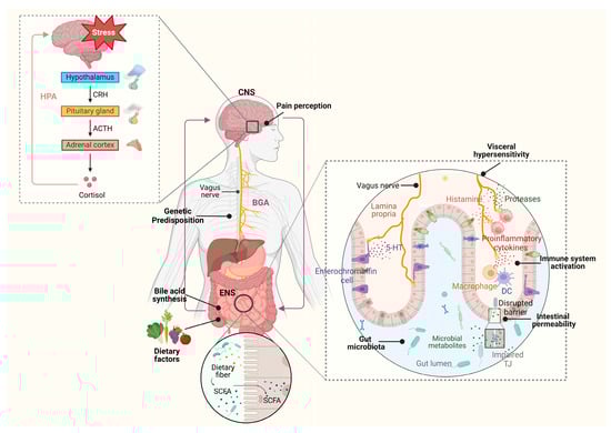 Figure 1 illustrates the key pathophysiological mechanisms underlying irritable bowel syndrome (IBS), focusing on the interplay between the brain–gut axis (BGA), enteric nervous system (ENS), immune system activation, gut microbiota and environmental factors. The hypothalamus, through the hypothalamic–pituitary–adrenal (HPA) axis, releases the corticotropin-releasing hormone (CRH), which stimulates the pituitary gland to secrete the adrenocorticotropic hormone (ACTH). This, in turn, induces the adrenal cortex to release cortisol, a stress-related hormone that influences gut function and pain perception through the central nervous system (CNS). CNS and ENS communicate bidirectionally via the vagus nerve, affecting pain perception, gut motility, and visceral sensitivity. Serotonin (5-HT), released by enterochromaffin cells in the gut, plays a crucial role in regulating gut motility and peristalsis. Impaired regulation in serotonin metabolism contributes to IBS symptoms such as diarrhea and constipation. Dietary factors, including fermentable oligosaccharides, disaccharides, monosaccharides, polyols (FODMAPs), and dietary fiber, influence gut microbiota composition and the production of short-chain fatty acids (SCFAs). These SCFAs impact gut barrier integrity and immune modulation. Alterations in bile acid synthesis impact gut motility and intestinal barrier function. Elevated intestinal permeability, mediated by impaired tight junctions (TJs), contributes to visceral hypersensitivity and low-grade inflammation. The gut microbiota, through microbial metabolites, interacts with the immune system, influencing gut barrier function and inflammation. The activation of the immune system, which involves macrophages, dendritic cells (DCs) and mast cells, releases pro-inflammatory cytokines, histamine, and proteases, further contributing to visceral hypersensitivity, impaired barrier function and pain perception. Genetic predisposition also plays a role, affecting serotonin metabolism, immune activation, and neuropeptide pathways. This proposed model underscores the multifaceted nature of IBS, emphasizing the role of neuroimmune interactions, gut microbiota, and environmental influences in disease pathogenesis. This figure was created with BioRender.com (accessed on 20 September 2025). Abbreviations: HPA, hypothalamic–pituitary–adrenal; CRH, corticotropin-releasing hormone; ACTH, adrenocorticotropic hormone; CNS, central nervous system; ENS, enteric nervous system; BGA, brain–gut axis; SCFAs, short-chain fatty acids; 5-HT, serotonin; DC, dendritic cell; TJ, tight junction.