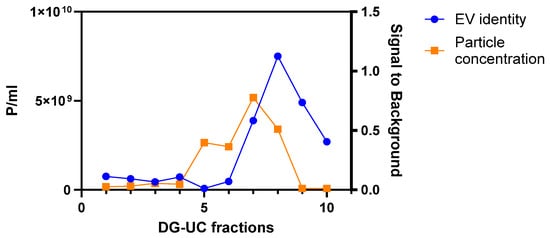Concentrated CM was purified by two methods: DG-UC and SEC. Purification runs were carried out in triplicate. Ten fractions of 1 mL were recovered by DG-UC. Particle concentration (Particles/mL) was measured in each fraction using a Flow NanoAnalyzer, while EV identity was assessed by the presence of the three tetraspanins CD9, CD63, and CD81 with an ELISA assay. Figure 1 shows an example of the overlay of results of the two assays for one purification run.