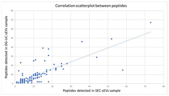 Correlation analysis of the subset of common proteins detected in the two sEV samples: scatterplot between the groups of peptides detected in SEC-sEVs (x-axis) and in DG-UC-sEVs (y-axis). Most of the points (peptides) are clustered around a straight line, indicating a medium–high correlation (correlation coefficient: 0.76).