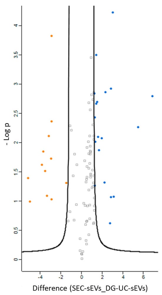 Volcano plot showing significantly differentially expressed proteins in SEC-sEVs (blue dots) and DG-UC-sEVs (orange dots). Grey dots are proteins that were not significantly differentially expressed. Samples were run duplicate.