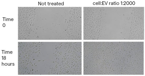 Images at 4× magnification of the wound space at Time 0 and 18 h without treatment and with treatment with DG-UC-sEVs from 2D culture at a cell–EV ratio of 1:2000.