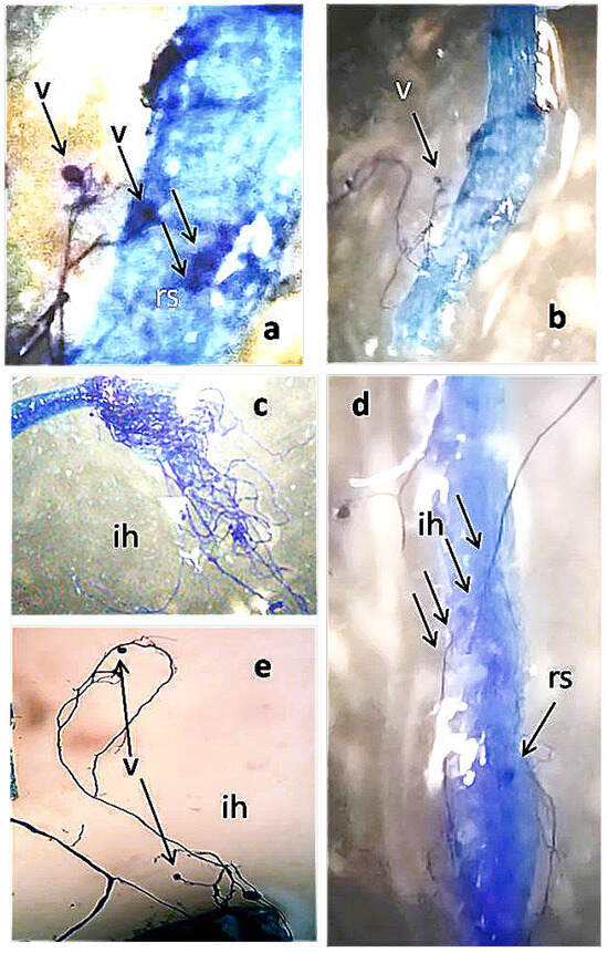 Tomato roots infected with arbuscular mycorrhizal fungi 1 month after FWC1 treatment, cleared and stained with KOH-lactophenol blue: (a) roots colonized by resting spores (rs) and vesicles (v) 100×, (b) 50×; (c,d) AMF-infected area and intra- and extra-radical mycelium (ih) with 1 resting spore × 50; (e) hyphae (ih) and vesicles emerging from roots 50×.