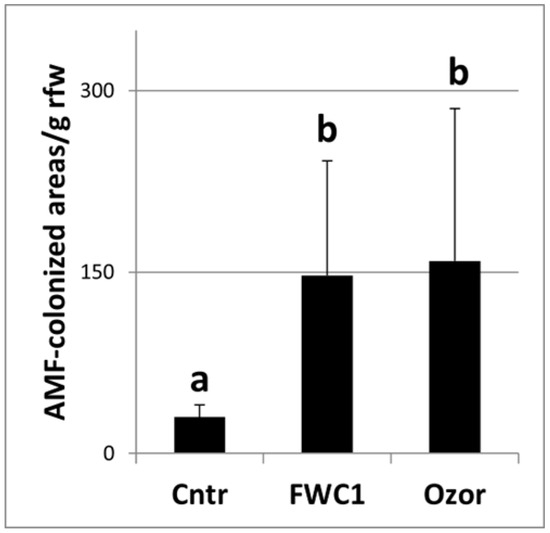 AMF-infected areas per g of root fresh weight (rfw) observed on KOH-lactophenol blue-treated roots under a stereoscope. Roots were collected 1 month after inoculation of plants with FWC1 and Ozor; another group of plants was left uninoculated (Cntr). Six different root samples coming from different plants were analyzed per treatment. Values are expressed as means (n = 6) ± standard deviations. Means were separated based on a Duncan’s Test, where different letters indicate significantly different means (significance level: 0.01).