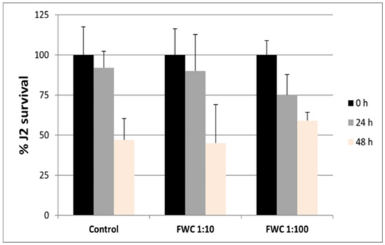 Other tests were arranged to determine if FWC1 had a direct toxic effect on nematode invading forms (J2s). Aqueous extracts of FWC1 were prepared and diluted 1:10 and 1:100, in which J2s were incubated for 48 h (Figure 3). Survival rates of J2s were measured after 24 and 48 h of incubation and compared with those of J2s incubated in water. No significant differences were found, thus indicating the absence of toxic effects of the formulation against J2s.