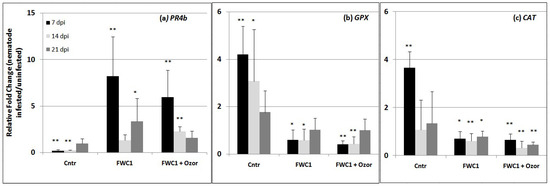 The expression of key genes, markers of induction of plant immune response against RKNs, was detected using qPCR (quantitative Real-Time PCR) in tomato roots 7, 14, and 21 days after nematode inoculation. Plants treated with FWC1 and a mix of FWC1 + Ozor were compared with untreated control plants. One of the tested genes was PR4b; its over-expression is indicative of hypersensitive cell death induction, and it is generally a marker of the execution of plant immunity following a biotic challenge [16]. In the successful RKN–tomato interaction occurring in control plants, the expression of the gene was markedly repressed until 14 dpi; conversely, when plants were treated with FWC1 and FWC1/Ozor, this gene was generally over-expressed, thus indicating the induction of plant immunity in treated plants (Figure 4a). For successful development in roots, nematodes induce the expression of genes encoding for antioxidant enzymes that actively detoxify reactive oxygen species, and in particular, hydrogen peroxide (H2O2). We tested two genes encoding the antioxidant enzymes glutathione peroxidase (GPX) and catalase (CAT), particularly active in H2O2 degradation [17]. As predicted, in the early stages of nematode attack, expressions of GPX and CAT were highly enhanced in the controls (Figure 4b,c); however, when plants were pre-treated with FWC1 and FWC1/Ozor, such enzyme-encoding genes were significantly down-regulated, thus indicating that the interaction with these compounds induces a peroxidative environment in roots at the early stages of nematode attack, which is detrimental to the pest’s development and can be considered as a process occurring in the plant immune response.