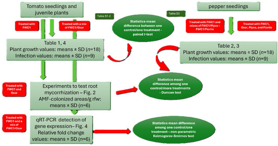 Three different bioassays were performed to test FWC1, Ozor, Myco, and Flortis as activators of defense against nematode infection and as biofertilizers; one bioassay consisted of 6 treated and 6 untreated inoculated plants, used as controls. Means of plant growth parameters are the results of 18 replicates, coming from 3 experiments. Conversely, as it concerned infection level, one value of each infection factor came from 2 root systems; therefore, means were obtained from 9 replicates. Means ± standard deviations of control and treated plants were separated based on a paired t-test (* p < 0.05) when just one treatment was compared with one control and based on a Duncan test (* p < 0.05) when more than one treatment was compared with one control using MS Excel software. The numbers of AMF-colonized root areas were expressed based on a fresh weight unit base. Values are the means of 6 different measurements at the stereoscope ± standard deviation; experiments to test AMF colonization of roots were designed to use 12 plants for each of the 3 tested treatments. Means ± standard deviations were calculated from 6 colored root samples; the means of control plants were separated from those of treated plants based on a Duncan test (* p < 0.05) using MS Excel Software. The values of the toxicity tests, in terms of % J2 survival, were recovered from triple counts at the stereoscope; means ± standard deviations were obtained from 3 values, and the significance of the difference between the means of the control surviving J2s and those of the J2s incubated in the FWC1 extracts was verified based on a paired t-test. For RNA extraction, plants coming from 2 independent bioassays were used; roots from 2 plants of the same treatment constituted one sample; RNA was extracted from 3 different samples of roots per treatment, harvested at each dpi. qRT-PCR data are expressed as means (n = 6) ± standard deviations of 2−ΔΔCt values of each group from treated/inoculated plants, considering as 1 the values of each group from untreated/inoculated plants, taken as controls. Significant differences with respect to controls were determined based on a non-parametric Kolmogorov–Smirnov test (* p < 0.05; ** p < 0.01) (Figure 5).