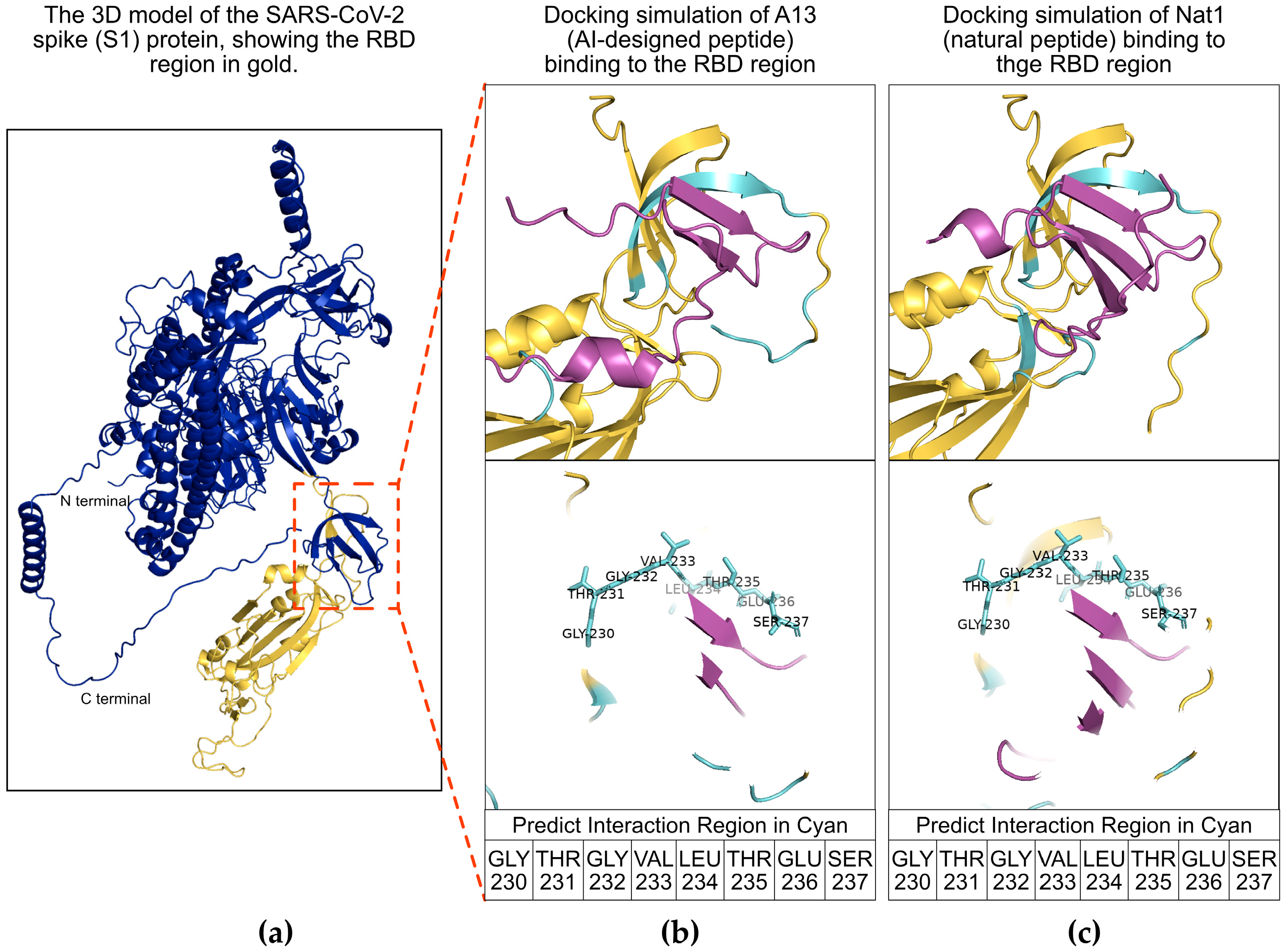 - Hajikarimlou, M.; Hooshyar, M.; Moutaoufik, M.T.; Aly, K.A.; Azad, T.; Takallou, S.; Jagadeesan, S.; Phanse, S.; Said, K.B.; Samanfar, B.; et al. A Computational Approach to Rapidly Design Peptides That Detect SARS-CoV-2 Surface Protein S. NAR Genom. Bioinform. 2022, 4, lqac058. [Google Scholar] [CrossRef]