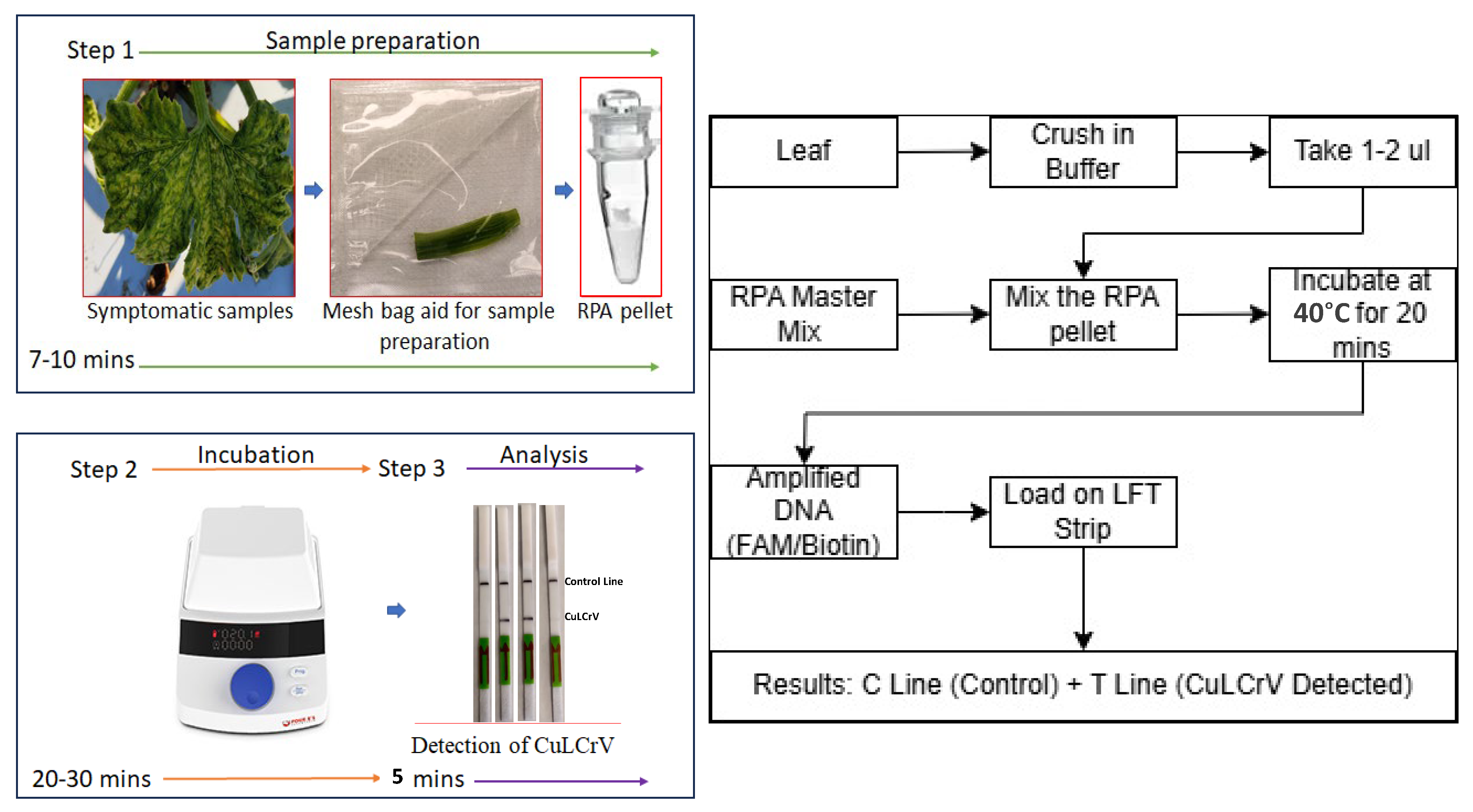 In this study, we developed a new RPA-based lateral flow test (LFT) assay for the detection of CuLCrV using the Tth endonuclease. This LFT assay is a user-friendly, rapid, and cost-effective diagnostic tool that combines the amplification and detection of the target nucleic acid in a single reaction. The LFT assay employs gold nanoparticle-conjugated probes that bind to the amplified product and produce a visible signal on the test strip. This signal can be easily read by the naked eye, eliminating the need for specialized equipment or trained personnel. The objective of this study was to evaluate the sensitivity and specificity of the RPA-based LFT assay for the detection of CuLCrV, and to compare its performance with that of traditional detection methods. The results of this study further demonstrate the potential of RPA-based LFT assays as a rapid and reliable diagnostic tool for the detection of CuLCrV in field setting, which can aid in the effective management and control of this destructive plant virus. The figure and flowchart’s schematic representations are explained in the field-based RPA-LFT assay development of CuLCrV detection (