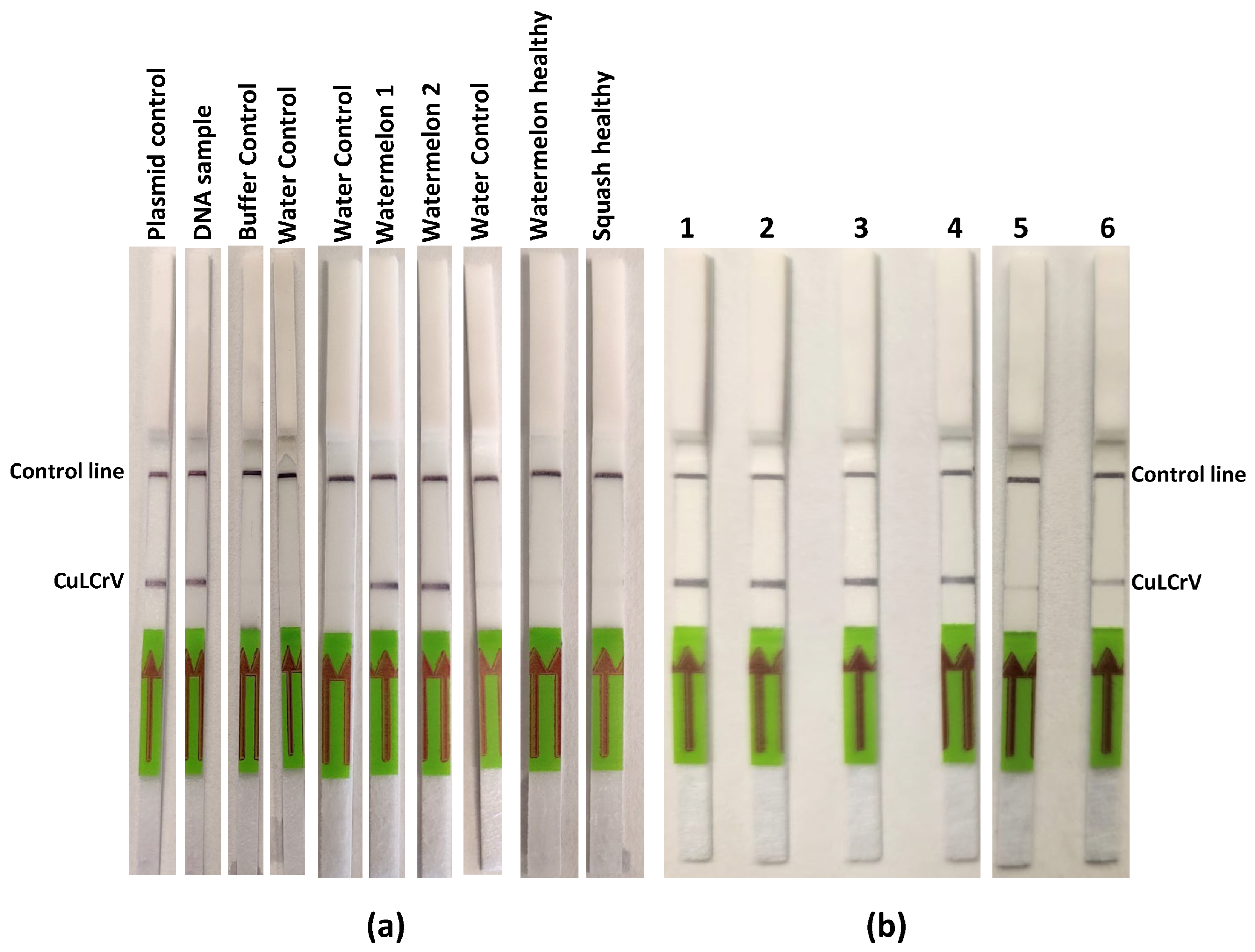 This study reports, for the first time, the successful development and validation of a Tth endonuclease-based RPA-LFT assay for the rapid detection of CuLCrV in both plant tissues and insect vectors. The novel incorporation of Tth endonuclease into the RPA-LFT platform significantly enhanced visual signal clarity and detection consistency compared to traditional enzyme systems such as endonuclease IV (Nfo), offering a substantial improvement in the assay’s diagnostic performance. The RPA-LFT assay exhibited excellent analytical sensitivity, detecting as few as 10 copies of the target DNA, and demonstrated complete specificity, with no cross-reactivity observed with closely related cucurbit-infecting viruses. Importantly, the assay produced reliable results using both purified DNA and crude extracts, underscoring its adaptability for field-based diagnostics without the need for complex nucleic acid extraction protocols or sophisticated equipment.