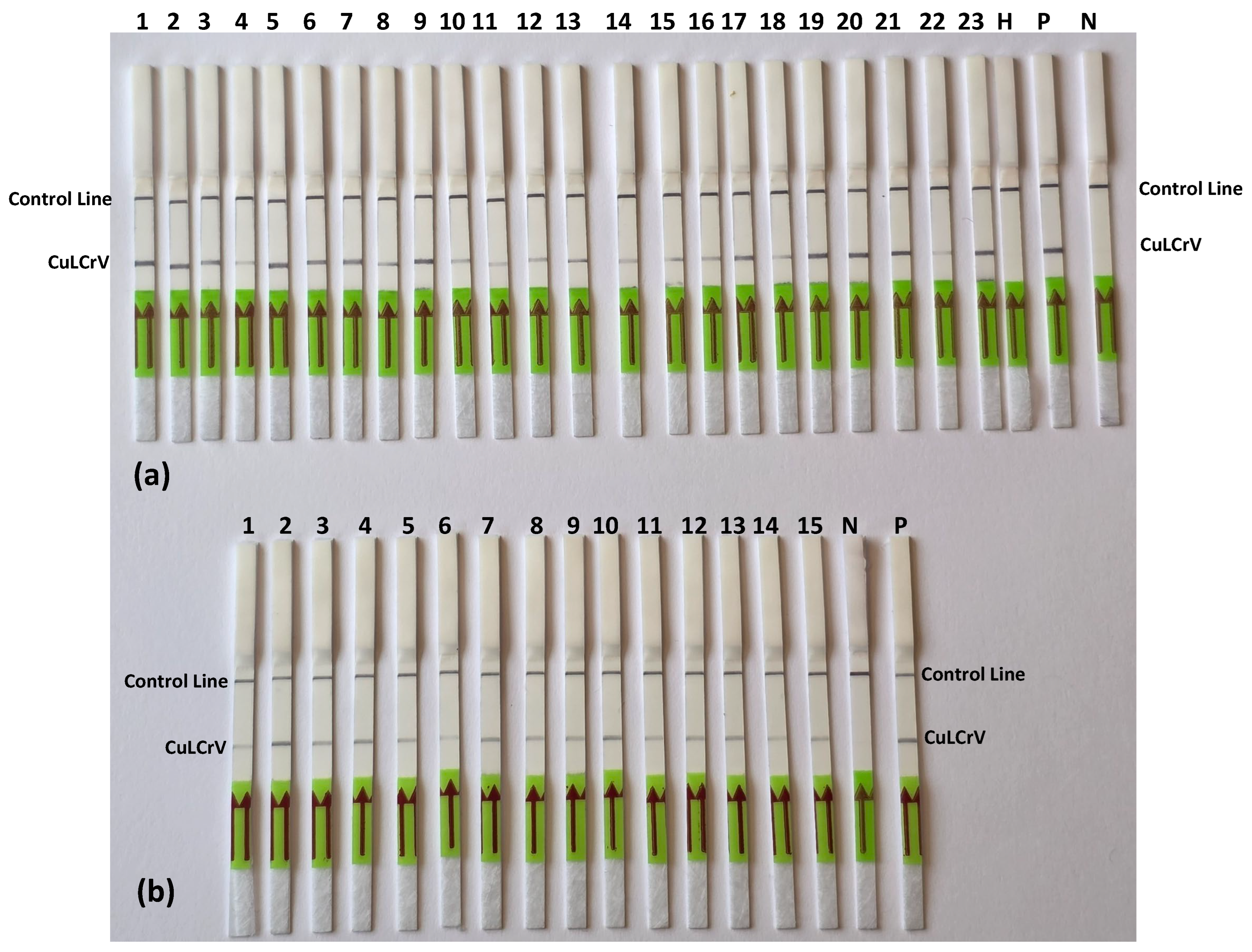 Following the completion of the CuLCrV RPA assay, the amplified products were analyzed using Milenia HybriDetect lateral flow test (LFT) strips for the detection of biotin- and FITC-labeled analytes. According to the manufacturer’s protocol, a 5 μL volume of the CuLCrV RPA amplification product was directly pipetted onto the sample application area of the Milenia® HybriDetect LFT strip. Subsequently, the test strips were immersed in a tube containing 100 μL of HybriDetect Assay Buffer and incubated for 5–15 min to observe the results.